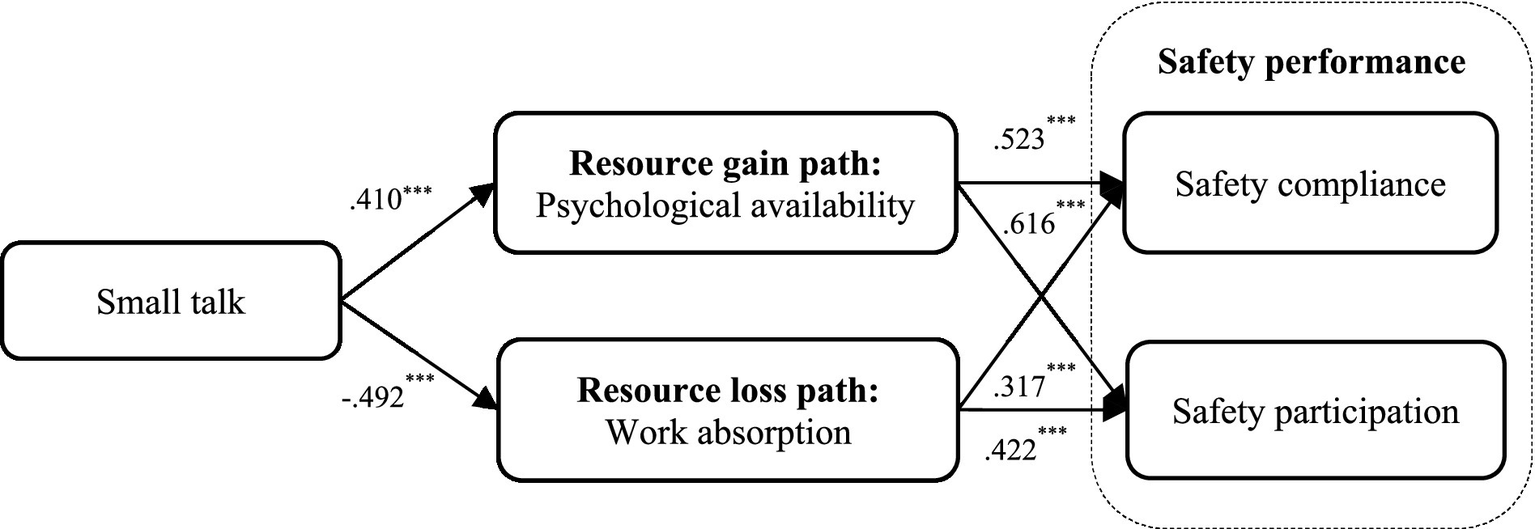 The results confirmed the dual effects of small talk on safety performance: small talk positively predicted safety performance through increasing psychological availability, while negatively predicted safety performance by reducing work absorption.