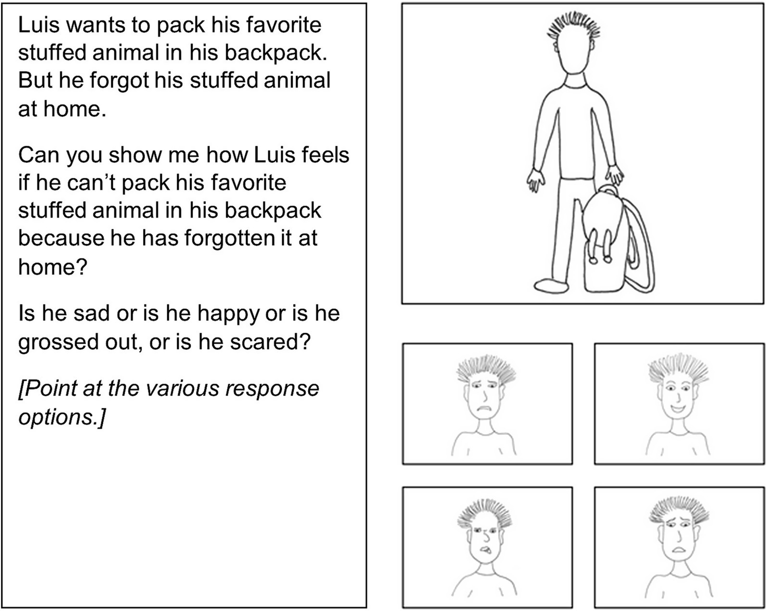 Emotion knowledge. Emotion knowledge was assessed with a pre-final version of the “Adaptive Test of Emotion Knowledge for Three- to Nine-Year-Old Children” (ATEM 3-9; Voltmer and von Salisch, 2022b) at t1 and t2. It consisted of 50 items at t1 and 40 items at t2, which assessed the following components of emotion knowledge: (1) Recognizing emotions in the face (Recognition), (2) Identifying emotions in situations (Situations), (3) Identifying mixed emotions (Mixed Emotions), (4) Identifying emotions from desires (Desires), (5) Identifying emotions from (false) beliefs (Beliefs), and (6) Differentiating between shown and felt emotions (Felt/Shown Emotions). However, only items that were included in the final version of the ATEM 3-9 were analyzed in the present study, resulting in 32 items in total (with 5–6 items per component). Children’s total EK scores were created by summing up their answers to these items. The difficulty of the items increased, within and between components, as the story within which they are embedded progressed. A sample item is displayed in Figure 2 (more examples can be found in Voltmer and von Salisch, 2022b). Skipping and termination rules allowed less advanced children to work on fewer items. Children answered the items by pointing to one of four drawings of facial expressions: anger, sadness, fear, happiness, disgust, or surprise. The expected A posteriori (EAP) reliability coefficients—which can be interpreted similarly to Cronbach’s alpha (Adams et al., 2015)—ranged from 0.85 to 0.94 across the six components, based on a sample that included the t1 data from the present study (Voltmer, 2019). An overall EAP reliability coefficient was also calculated for the 32-item version of the scale used in this study, and this calculated reliability was high (EAP reliability = 0.93). Based on a smaller sample of t2 from the current study, we calculated an overall posttest EAP reliability of 0.87.
