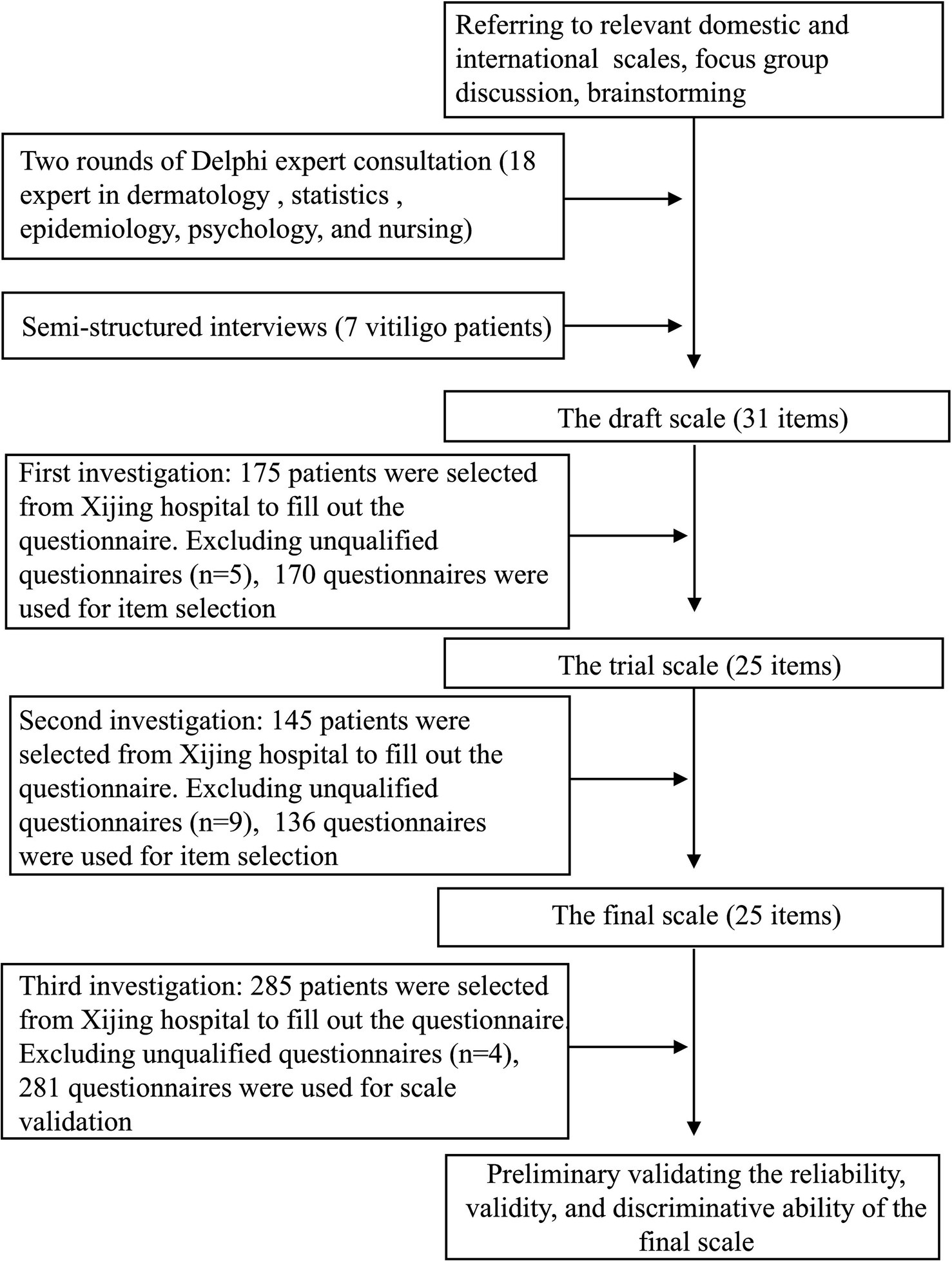 The conceptual model of the scale was developed after a comprehensive review of relevant domestic and international literature. The review focused particularly on the quality of life in individuals with vitiligo. After that, we gathered the item pool, by referencing established scales, including the Vitiligo-specific-quality-of-life instrument (VitiQoL), Dermatology Life Quality Index (DLQI), Skindex-16, Vitiligo Impact Scale-22 (VIS-22), Rosa Quality of Life (RosaQoL) (Tannus et al., 2018), Vitiligo Patient Satisfaction (VIPS) (Salzes et al., 2016), and Vitiligo Life Quality Index (VLQI). We had a focus group discussion to ensure that the item pool adequately encompassed the connotations and scope of the conceptual model. Subsequently, the Delphi consultation method was used to assess the validity of the gathered information. Experts from various fields, including dermatology (11), statistics (1), epidemiology (1), psychology (3), and nursing (2), participated in two rounds of the Delphi consultation. We then conducted focus group discussion again to modify the items’ contents. The item pool was then assessed through semi-structured interviews with 7 participants diagnosed with vitiligo, who were selected from the outpatient departments of Xijing Hospital, to ensure that all aspects of the patients’ impaired quality of life were covered by the item pool without duplication. Finally, a draft scale with 31 items was formed after the third focus group discussion.