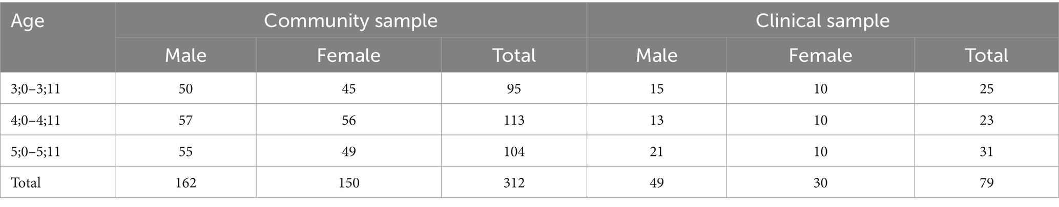 A total of 79 preschoolers from kindergartens/kindergarten-cum-child care centres participating in the On-site Preschool Rehabilitation Services in Hong Kong was recruited to comprise the clinical sample. These kindergartens/ kindergarten-cum-child care centres provide preschool rehabilitation services to children with special needs, and only students with diagnoses (e.g., global developmental delay, autism spectrum disorder, attention deficit/hyperactivity disorder, etc.) by pediatricians or psychologists are entitled to these services. The age and gender distributions of the clinical sample are listed in Table 2.