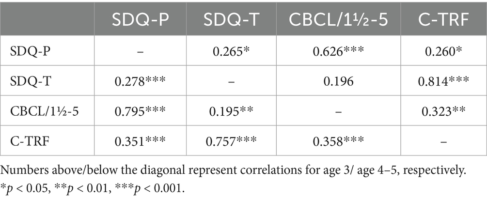 The internal consistencies of SDQ-P and SDQ-T, as well as those of CBCL/1½-5 and C-TRF, were shown in Table 3. All scaled yielded satisfactory internal consistency, with Cronbach’s αs being greater than 0.7. However, the internal consistencies of CBCL/1½-5 and C-TRF, which were above 0.95, were higher than those of SDQ-P and SDQ-T, which fell between the range of 0.70 to 0.85.