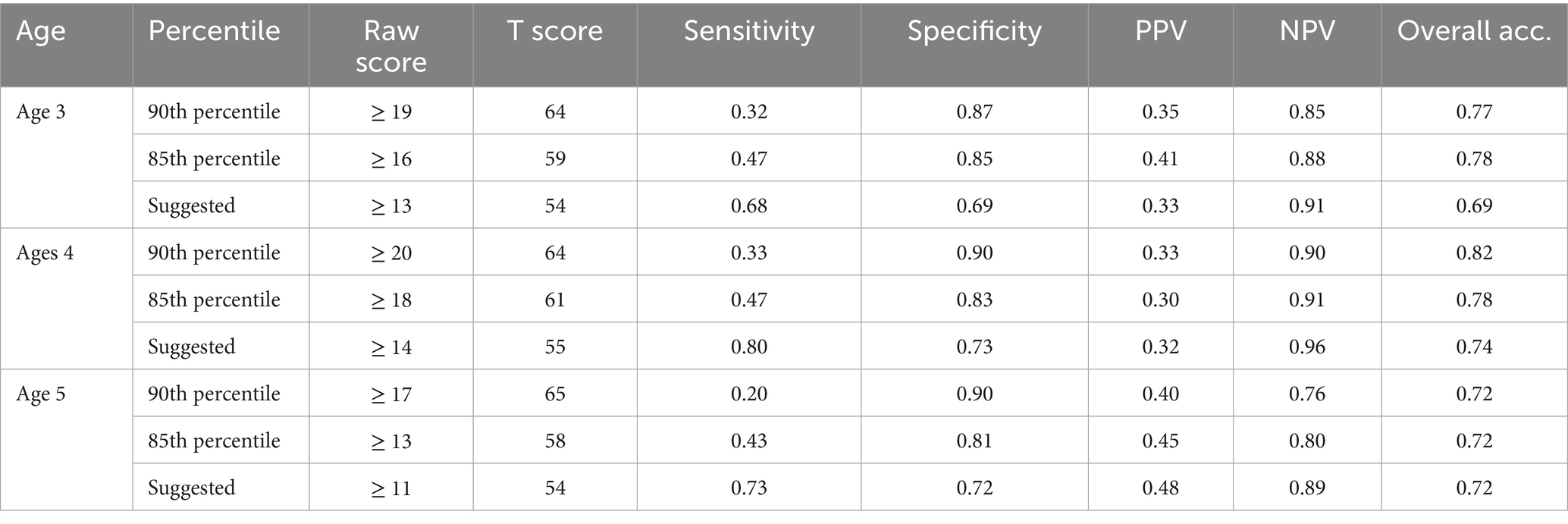 Based on the score distribution of the SDQ-T total difficulties scores, we explored the sensitivities, specificities, positive predictive values, negative predictive values, and overall classification accuracies across the three age groups by varying the cutoff values (see Table 6). While the two cutoff values proposed by Goodman (1997) and Lai et al. (2010) (i.e., 90th and 85th percentiles respectively) resulted in high specificities (SP ≥ 0.80), the sensitivities were low (SE ≤ 0.47). The cutoff was adjusted downwards to a T score of approximately 54, which resulted in comparable sensitivities and specificities (Age 3: SE = 0.68, SP = 0.69; Age 4: SE = 0.80, SP = 0.73; Age 5: SE = 0.73, SP = 0.72). Given the purpose of SDQ was to screen children who may need further assessments, sensitivity was valued over specificity, and the cutoff T value of 54 was recommended.