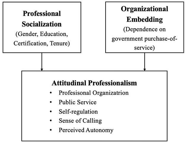 Integrating these strands, we conceptualize attitudinal professionalism, as operationalized by the five components derived from Hall's model, as an individual-level outcome shaped by professional socialization routes and organizational embedding (see Figure 1). Socialization is captured through gendered pathways, education, licensure, and tenure, which function as observable traces of how values and role expectations have been transmitted and internalized. Organizational embedding is operationalized as organizational dependence on government purchase of services, a salient feature of China's administratively embedded regime that is directly observable in our data. This formulation is consistent with the layered view of professionalism while remaining empirically tractable.