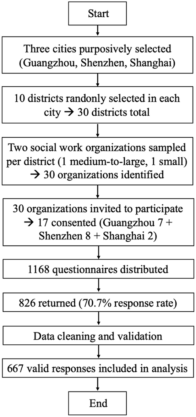 A multi-stage cluster sampling design was then implemented. In each city, five districts were randomly selected. Lists of social work organizations were compiled from the official municipal portals. To ensure organizational stability and relevance to frontline practice, inclusion criteria were: (1) founded for at least 1 year; (2) providing direct services; and (3) having at least 10 full-time employees. To preserve heterogeneity by scale, organizational rosters were stratified by size: agencies with more than 30 full-time social workers were classified as medium-to-large, and those with fewer than 30 full-time social workers were considered small organizations. From each sampled district, two organizations (one medium-to-large and one small) were randomly selected, yielding 30 organizations identified across the three cities. Invitations were sent by email or telephone. Ultimately, 7/10 organizations in Guangzhou and 8/10 in Shenzhen consented and participated; in Shanghai, 2/10 organizations agreed to participate. Employees from the consenting organizations constituted the study sample. Non-response at the organizational level (17/30 participating) and the focus on three developed metropolitans constrain external validity. Therefore, findings should be generalized primarily to similar urban contexts rather than to inland or county-level settings.