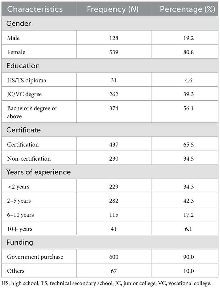 Tables 1–3 present descriptive statistics of study variables (N = 667). A large proportion of the sample was female (80.8%). More than half of the participants had a bachelor's degree or above (56.1%), and had certain type of social work qualification certification (65.5%). In terms of years of work experience in the field of social work, 42.3% had been in the field for 2–5 years, followed by 34.3% for less than 2 years, 17.3% in the field for 6–10 years, and 6.1% for more than 10 years. The vast majority of the sample worked for organizations that were heavily dependent on government's purchase of social services for living (90%).