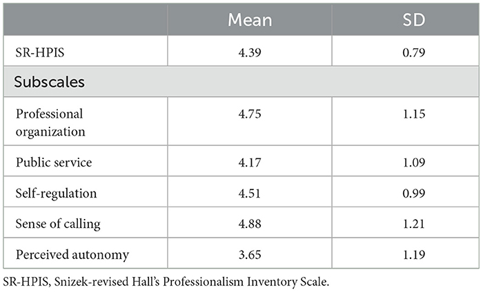 Chen, X., Yu, Q., Yu, F., Huang, Y., and Zhang, L. (2019). Psychometric evaluation of the Chinese version of the Snizek-revised Hall's Professionalism Inventory Scale. J. Int. Med. Res. 47, 1154–1168. doi: 10.1177/0300060518817401