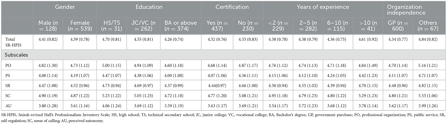 The mean composite professionalism score achieved by the 667 social workers was 4.39 (SD = 0.79). In term of subscales, the highest score was obtained in Sense of Calling (M = 4.88, SD = 1.21), while the lowest score was Perceived Autonomy (M = 3.65, SD = 1.19). Male social workers (M = 4.41, SD = 0.82) had higher total professionalism score than females (M = 4.39, SD = 0.78). High school or technical secondary school graduated social workers had the highest score on total professionalism (M = 4.70, SD = 0.81), followed by junior or vocational college graduates (M = 4.55, SD = 0.81), and then the individuals holding a bachelor's degree or above (M = 4.26, SD = 0.74). Social workers with qualification certification (M = 4.32, SD = 0.76) scored lower on total professionalism than their counterparts not having any certifications (M = 4.53, SD = 0.83). The most experienced social workers (more than 10 years of experience) scored the highest on total professionalism (M = 4.61, SD = 0.92), while social workers have been in the field between 6 and 10 years scored the lowest (M = 4.36, SD = 0.75). Moreover, social workers working in independent organization (not primarily relying on government purchase) scored higher on total professionalism (M = 4.84, SD = 0.82) than their counterparts in dependent organizations (M = 4.34, SD = 0.77).