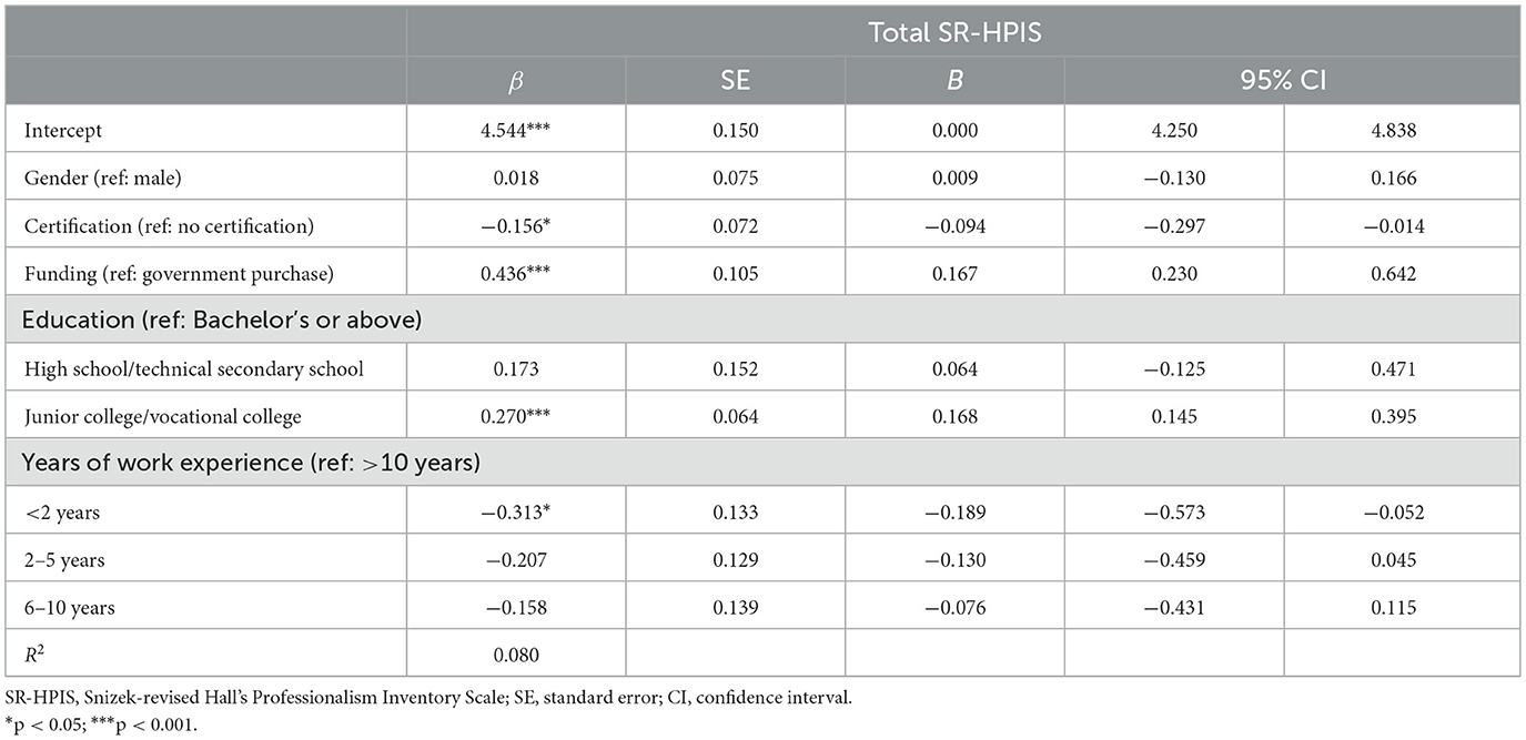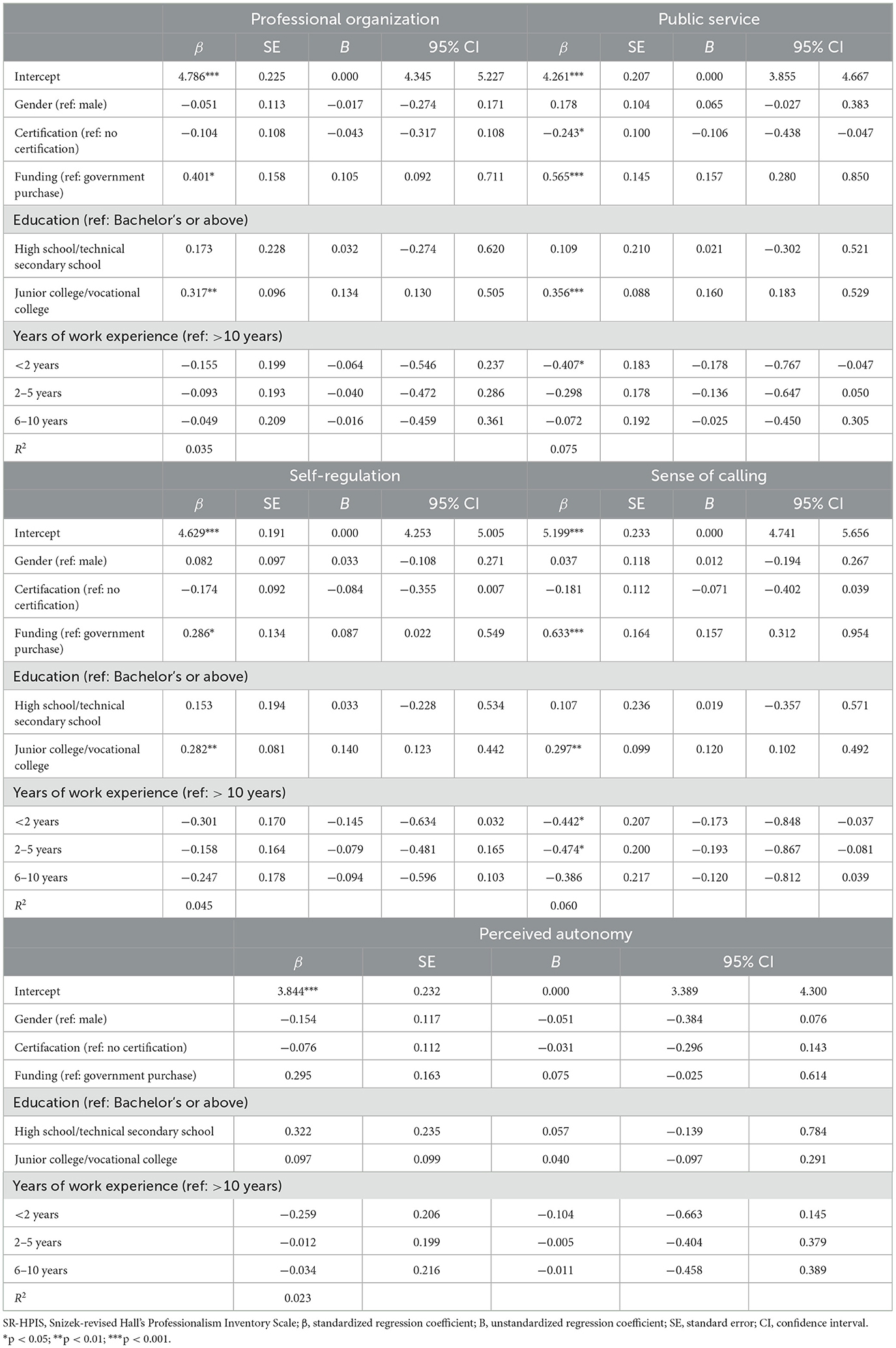 Tables 4, 5 show findings from the multiple regression models using the five professionalism subscales and the total SR-HPIS scale as dependent variables, respectively. Male and female social workers had no significant differences in total professionalism scores as well as five attitudinal attributes' scores. Having qualification certification was negatively associated with the subscale of Public Service [β = −0.243, 95% CI (−0.438, −0.047)], indicating that practitioners who had not been identified as qualified social workers believed in that his/her profession is both indispensable and beneficial to society more than did their counterparts who had qualification certifications. Accordingly, social workers not having certification had higher levels of professionalism, as reflected in the association of certification and the total SR-HPIS scale [β = −0.156, 95% CI (−0.297, −0.014)]. In addition, organization independence was positively associated with the total SR-HPIS scale [β = 0.436, 95% CI (0.230, 0.642)], as well as four subscales, including Professional Organization [β = 0.401, 95% CI (0.092, 0.711)], Public Service [β = 0.565, 95% CI (0.280, 0.850)], Self-Regulation [β = 0.286, 95% CI (0.022, 0.549)], and Sense of Calling [β = 0.633, 95% CI (0.312, 0.954)]. This indicates that social workers working in independent organizations had higher levels of professionalism, and were more conscious about using professional organizations as major referents, believing more in public service, as well as self-regulation, and more devoted to his/her work, comparing to social workers in dependent organizations. However, independence had non-significant association with the scale of perceived autonomy. Social workers graduated from junior or vocational college had higher scores in Professional Organization [β = 0.317, 95% CI (0.130, 0.505)], Public Service [β = 0.356, 95% CI (0.183, 0.529)], Self-regulation, and Sense of Calling [β = 0.282, 95% CI (0.123, 0.442)] than those who had a bachelor's degree or above (i.e., the reference group). Moreover, social workers holding a junior college or vocational college's degree had global attitudes toward the profession of social work, which were more positive than the attitudes of those who had a Bachelor's degree or above [β = 0.270, 95% CI (0.145, 0.395)]. Respondents with less than 2 years of work experience [β = −0.442, 95% CI (−0.848, −0.037)] and 2–5 years of experience [β = −0.474, 95% CI (−0.867, −0.081)] in the field of social work felt less calling from the field than their counterparts in the field for more than 10 years (i.e., the reference group). Further, social workers with less than 2 years of experience possess a weaker belief in Public Service [β = −0.407, 95% CI (−0.767, −0.047)] than those more experienced counterparts (more than 10 years of experience). In general, there was relatively strong evidence showing that years of experience was negatively associated with social workers' professionalism, specifically indicating that social workers with less than 2 years of experience had lower levels of professionalism than those who had been in the field for more than 10 years [β = −0.313, 95% CI (−0.573, −0.052)].