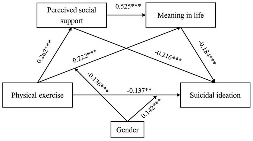 The regression analysis results (Table 3) demonstrated that physical exercise significantly and negatively predicted college students’ suicidal ideation (β = −0.154, p < 0.01). When perceived social support and meaning in life were first incorporated into the regression model, physical exercise retained its significant negative predictive effect on suicidal ideation (β = −0.041, p < 0.05). Furthermore, physical exercise positively predicted perceived social support (β = 0.218, p < 0.01) and meaning in life (β = 0.131, p < 0.01), respectively. Perceived social support, in turn, positively predicted meaning in life (β = 0.513, p < 0.01) while negatively predicting suicidal ideation (β = −0.243, p < 0.01), and meaning in life also significantly negatively predicted suicidal ideation (β = −0.246, p < 0.01).