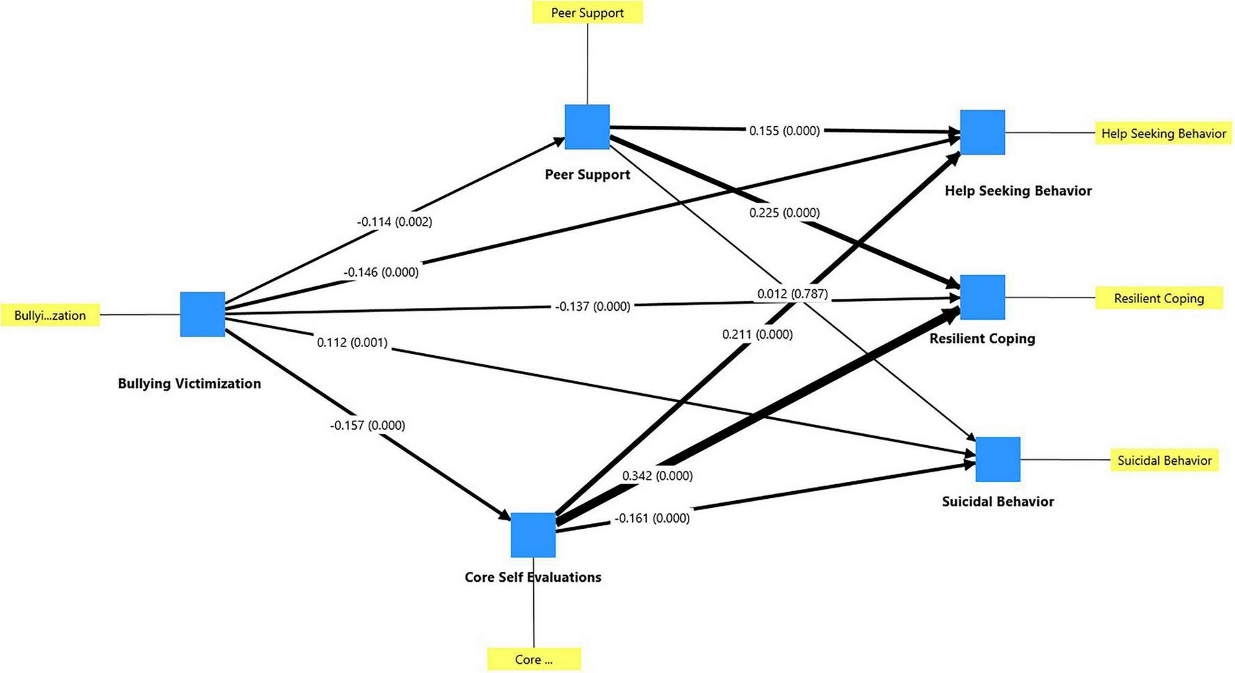 As Table 3 shows, the mediation analysis highlights the crucial role of peer support and core self-evaluations in shaping the impact of bullying victimization. Core self-evaluations significantly influence help-seeking attitudes and resilient coping, demonstrating that higher self-worth and emotional stability can buffer the adverse effects of victimization. Similarly, peer support was positively associated with help-seeking attitudes and resilient coping, reinforcing the importance of social networks in mitigating the psychological impact of victimization. However, peer support did not significantly mediate the relationship between bullying victimization and suicidal behavior, indicating that other mechanisms may be involved in this association. Figure 2 displays the standardized path coefficients as well as the p-values.
