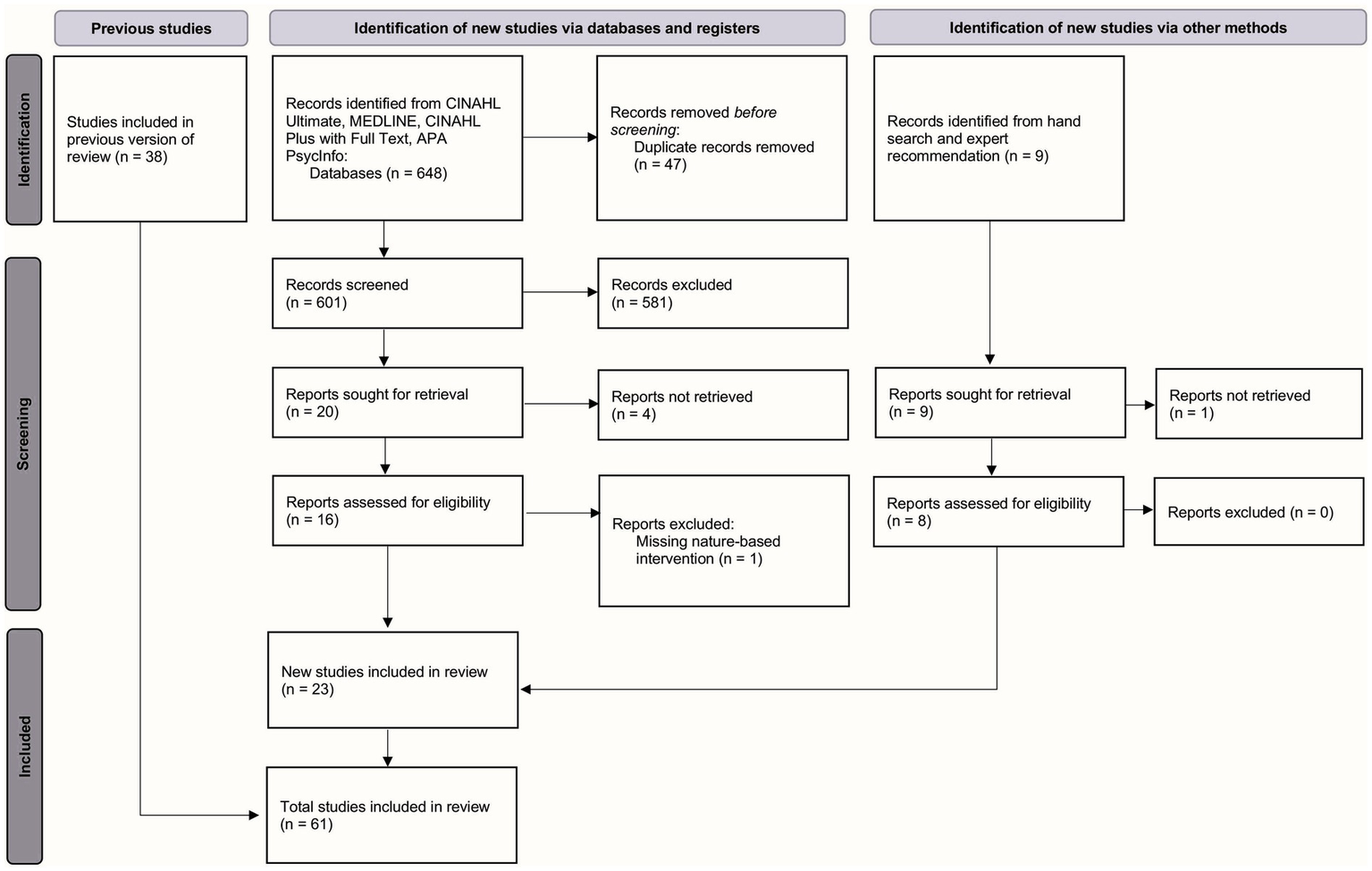 The systematic review used the narrative synthesis approach following the PRISMA guidelines, using the following databases: Academic Search Complete, APA PsycInfo, CINAHL, MEDLINE, and included only peer-reviewed review articles in English which explored Nature Based Interventions (NBIs), excluding animal-based interventions. The quality review was conducted using AMSTAR-2.
