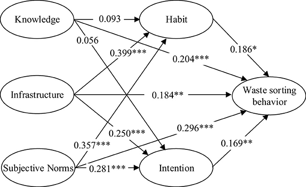 Motivation refers to all brain processes that motivate and direct behavior, including habitual and emotional responses, as well as analytical decision-making processes (Michie et al., 2011). The change from the old waste disposal strategy of employing a single trash can to “automatic” waste sorting into various containers (Timlett and Williams, 2009) necessitates significant intrinsic incentives. The motivation for waste sorting can be divided into two types: habit that arises spontaneously and behavioral intention that emerges after considerable thought. Waste sorting, a daily practice conducted under comparable conditions, has the potential to become a habitual practice. Once waste sorting becomes a spontaneous habit, it becomes simple to develop repetitive behaviors; hence, habit is an important variable that supports long-term behaviors (Broers et al., 2021).