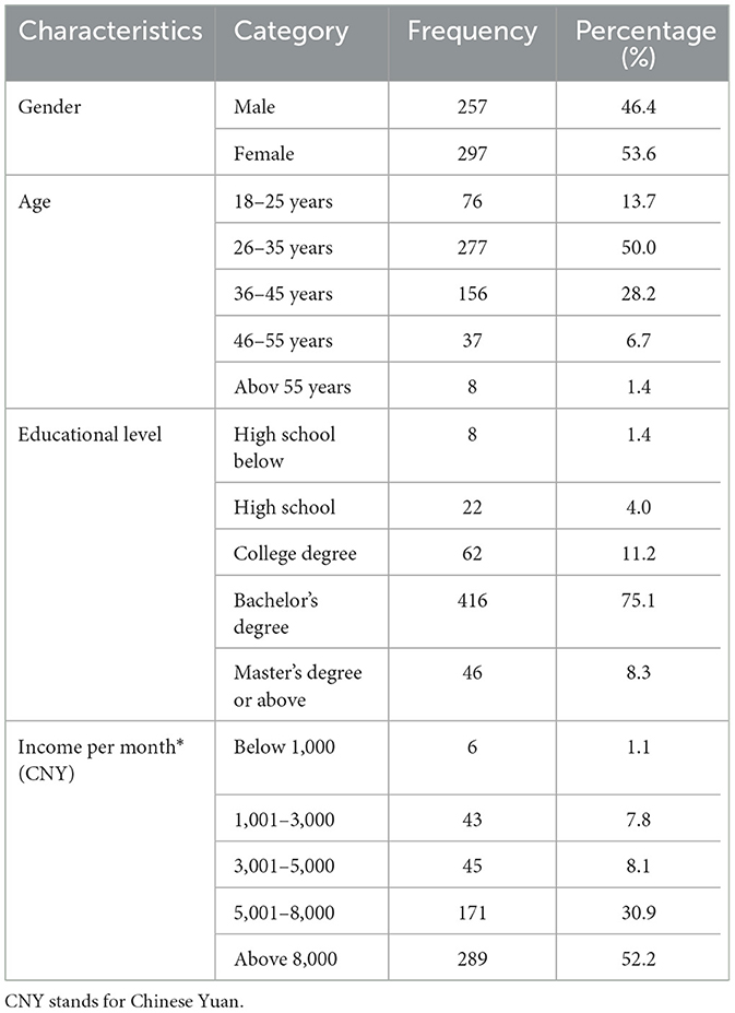 From January 4 to 26, 2025, data were collected via the Chinese Professional Survey website (https://www.wjx.cn/). Since Shanghai was among the first cities in China to mandate waste sorting and serves as a national model, so its residents were surveyed. Participants were assured of anonymity and that data would be analyzed in aggregate. A total of 589 responses were received, with 35 excluded for non-compliance, resulting in 554 valid questionnaires and a 94.1% valid response rate—over 10 times the number of measured variables (Fornell and Larcker, 1981).