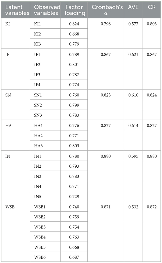 To verify construct validity, a confirmatory factor analysis (CFA) was performed using Mplus 8.3 software. Structural validity can be assessed using three criteria: (1) each measurable variable's factor loading should surpass 0.6; (2) each latent variable's composite reliability (CR) should exceed 0.7; and (3) the average variance extracted (AVE) for each latent variable should be more than 0.5 (Fornell and Larcker, 1981).