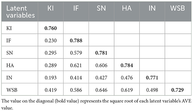 Table 2 shows the standardized Cronbach's α, CR, and AVE for each variable, as well as the factor loadings for its indicators. The questionnaire data demonstrated strong reliability, with a total Cronbach's alpha of 0.92, and each variable having a value greater than 0.7. The factor loadings of each measured indicator for variables ranged from 0.5 to 0.95, and each variable's composite reliability (CR) exceeded 0.7. The average variance extracted (AVE) value exceeded 0.5. The findings show that the convergent validity of the variables fits the research standards.