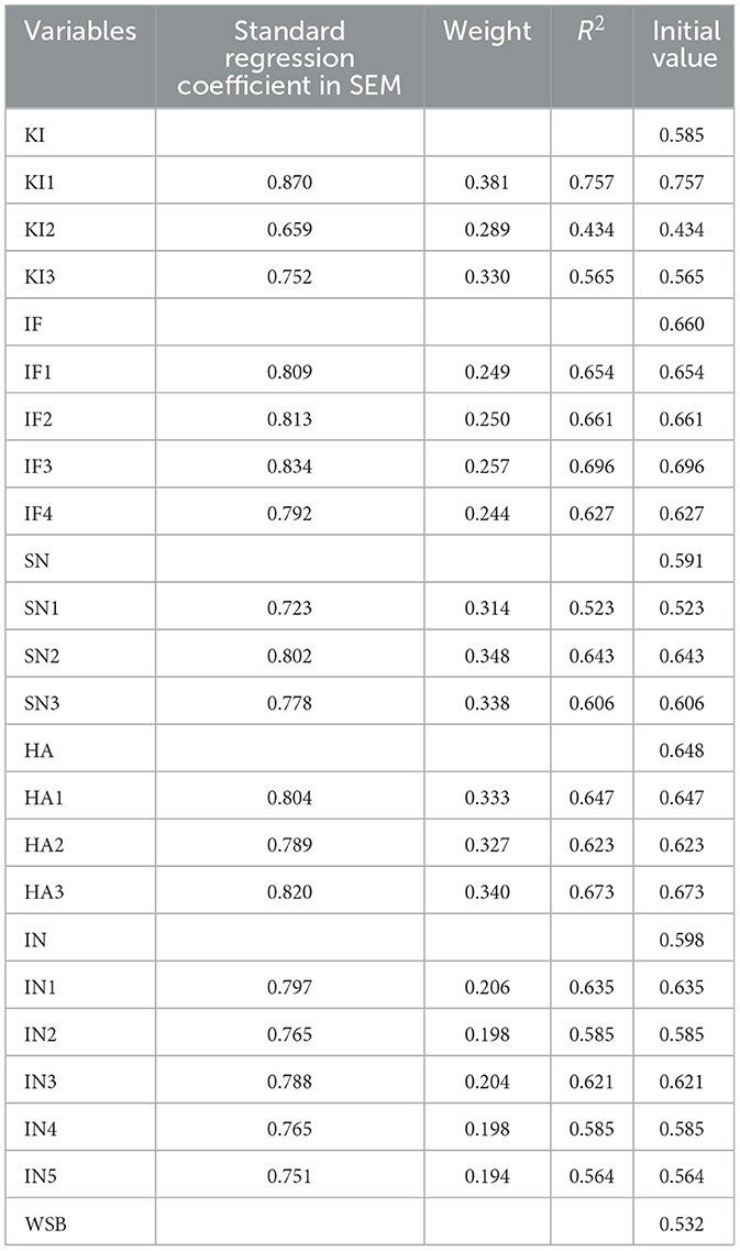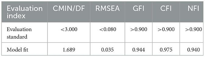 Following the validation of the scale data, the model was fitted using Mplus 8.3 software, and the goodness of fit was evaluated to confirm that the model was statistically tractable and capable of producing stable and reasonable outcomes (Wu et al., 2015). The model was evaluated using a combination of the chi-square/degrees of freedom (CMIN/DF), root mean square error of approximation (RMSEA), global fit index (GFI), comparative fit index (CFI), and normal fit index (NFI). The SEM showed a high goodness of fit when the indices matched the fitting conditions. Based on the standardized path coefficients obtained from model fitting, an intuitive understanding of the magnitude of each variable's effect was provided.