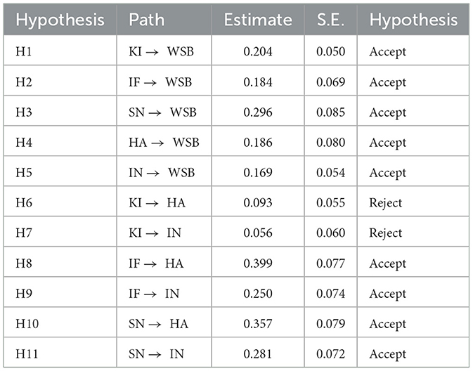 Table 4 displays the primary fitness test indicators for model fit, demonstrating that the data and the SEM model were able to establish a good fit. Figure 3 further illustrates the validated path relationships. The analysis in Table 5 reveals that all the SEM model path hypotheses (H1-H11) are significantly established, except for the standard path coefficients of H6 and H7, which do not meet the p < 0.05 requirement and hence, they are not supported. It can be found that KI has a direct association with WSB but no indirect effect. The R2 of WSB was 0.601, and the factors in the model explained 60.1% of the WSB variation.