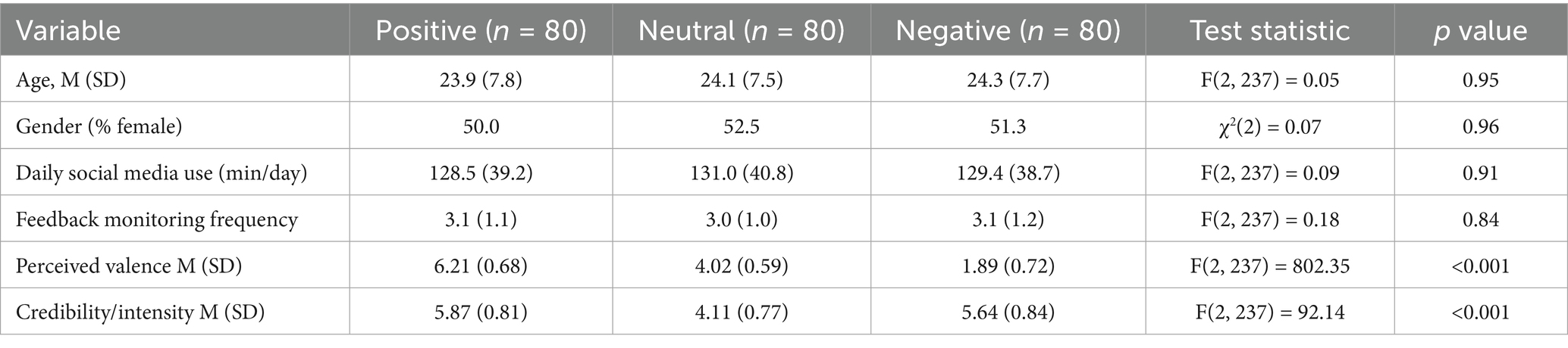 Before testing hypotheses, we first examined whether random assignment produced comparable groups across the three feedback conditions (positive, neutral, negative). One-way ANOVAs were conducted for continuous variables (age, daily social media use, and feedback monitoring frequency), and chi-square tests were used to examine the distribution of genders. No significant differences were found on any demographic or usage variable (p values > 0.10), indicating balanced groups prior to exposure. Next, to verify the effectiveness of the feedback manipulation, participants rated the perceived valence of the feedback (“How positive or negative was the feedback you saw?”; 1 = very negative, 4 = neutral, 7 = very positive) and the perceived credibility/intensity of the feedback (“How believable and emotionally impactful was the feedback you saw?”; 1 = not at all, 7 = extremely). One-way ANOVAs confirmed significant differences in perceived valence across conditions (p < 0.001), with positive feedback rated as more positive, neutral feedback as intermediate, and negative feedback as more negative. Credibility/intensity ratings were also significantly higher in the positive and negative conditions than in the neutral condition (p < 0.001). These results confirm that the randomization procedure produced demographically and behaviorally equivalent groups at baseline and that the feedback manipulation was both directionally effective and perceived as credible and impactful (Table 1).