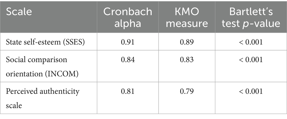 Cronbach’s alpha coefficient, the Kaiser-Meyer-Olkin (KMO) measure, and Bartlett’s sphericity test were calculated to assess the internal consistency and construct validity of the instruments. As shown in Table 2, all measures demonstrated good reliability, with Cronbach’s alpha coefficients ranging from 0.81 to 0.91, all of which exceeded the 0.70 criterion for psychological measurements. KMO values were also high (0.79–0.89) and indicated adequate sampling for factor analysis. Bartlett’s test was significant (p < 0.001) for all instruments, indicating that the data were appropriate for multivariate analysis. These results demonstrate the statistical reliability and structural validity of the psychometric instruments.