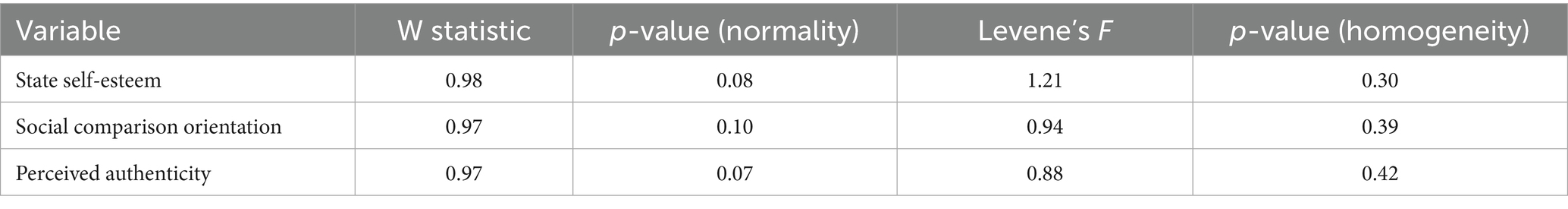 We used the Shapiro–Wilk test to assess the normality assumption for the key continuous variables. As shown in Table 3, all test p-values were greater than 0.05 (range = 0.076–0.102), indicating no significant deviations from normality. W statistics were close to 1.0 (e.g., W = 0.98 for State Self-Esteem), further supporting the assumption. Levene’s tests for equality of variances indicated that the homogeneity of variance assumption was met for all ANOVA models (p > 0.05), and Brown–Forsythe tests yielded the same conclusion. Given that neither normality nor homogeneity assumptions were violated, no Welch or other robust corrections were required. These findings supported the applicability of parametric statistics, such as ANOVA and regression, in the subsequent hypothesis testing.