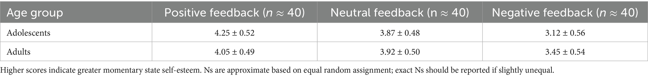 Table 4 presents descriptive statistics (means ± SDs) for post-exposure state self-esteem across the Age × Feedback Valence cells. Adolescents generally showed larger score shifts between positive and negative conditions compared to adults.