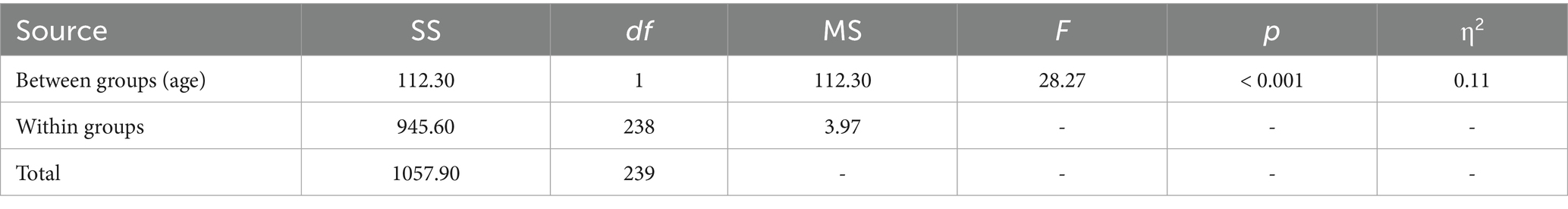 Table 5 shows that age had a significant effect on post-feedback state self-esteem, F(1, 238) = 28.27, p < 0.001, with a large effect size (η2 = 0.11). Adolescents reported greater sensitivity in self-esteem than adults, supporting the developmental sensitivity hypothesis (H1).