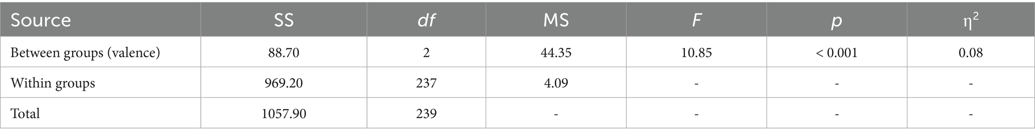 Table 6 reveals a significant main effect of feedback valence on state self-esteem, F(2, 237) = 10.85, p < 0.001, with a medium effect size (η2 = 0.08). Participants who received positive feedback reported higher self-esteem than those in neutral or negative feedback conditions, confirming the valence main effect hypothesis (H2).