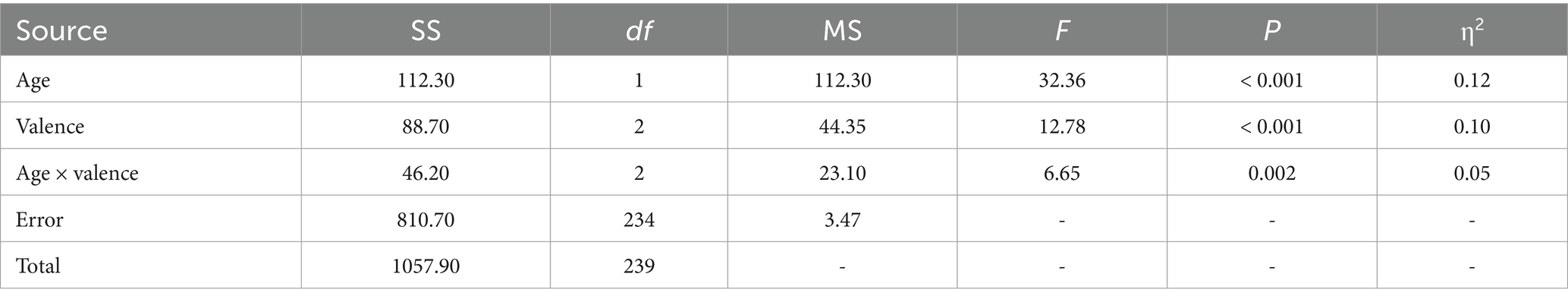 Table 7 shows a significant Age × Valence interaction, F(2, 234) = 6.65, p = 0.002, with a small-to-medium effect size (η2 = 0.05). This indicates that the impact of feedback valence on state self-esteem varied by age, with adolescents showing larger increases after positive feedback and greater decreases after negative feedback compared to adults, supporting the interaction hypothesis (H3).