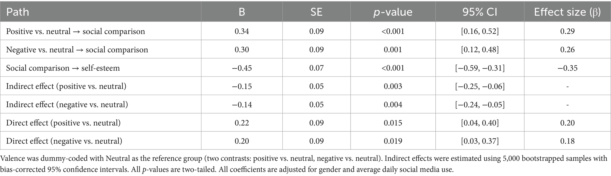 The mediation analysis (Table 8) indicated that, relative to the neutral feedback condition, both positive and negative feedback significantly predicted higher social comparison orientation (Positive vs. Neutral: B = 0.34, p < 0.001, β = 0.29; Negative vs. Neutral: B = 0.30, p = 0.001, β = 0.26). In turn, higher social comparison orientation significantly predicted lower state self-esteem (B = −0.45, p < 0.001, β = −0.35). Bootstrapped indirect effects were significant for both contrasts (Positive vs. Neutral: B = −0.15, 95% CI [−0.25, −0.06], p = 0.003; Negative vs. Neutral: B = −0.14, 95% CI [−0.24, −0.05], p = 0.004), confirming partial mediation of the valence–self-esteem relationship through social comparison. Direct effects of feedback valence on self-esteem remained significant but were smaller in magnitude (Positive vs. Neutral: B = 0.22, p = 0.015, β = 0.20; Negative vs. Neutral: B = 0.20, p = 0.019, β = 0.18), supporting the mediation hypothesis (H4) while indicating that other unmeasured factors may also contribute to the effect.