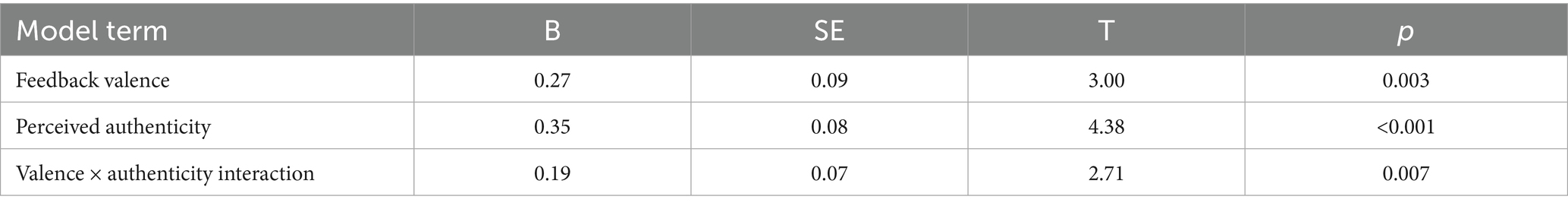 The moderation analysis (Table 9) indicated that both feedback valence (B = 0.27, p = 0.003) and perceived authenticity (B = 0.35, p < 0.001) significantly predicted state self-esteem. The significant Valence × Authenticity interaction (B = 0.19, p = 0.007) suggests that higher authenticity buffered the negative impact of less favorable feedback on state self-esteem across the full sample.