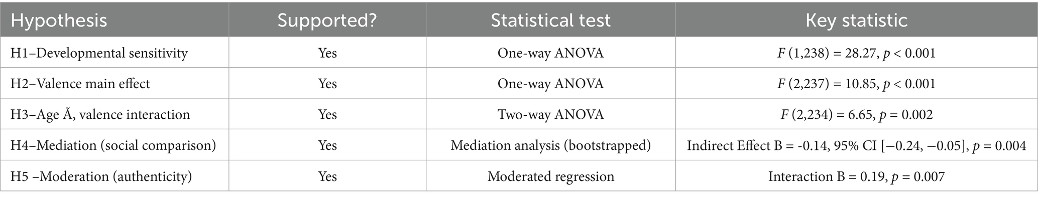 The results of all five hypotheses tested are presented in Table 10, and all received significant support. Results provided further evidence that the level of variance in self-esteem is higher among youth compared to adult age groups regarding social media feedback (H1) and that feedback valence significantly affects self-esteem, with positive feedback exerting a more substantial effect, regardless of age (H2). A meaningful interaction effect revealed that adolescents are more sensitive to feedback valence than adults (H3). Moreover, social comparison orientation was a significant mediator of the effect of feedback valence on self-esteem (H4), and perceived authenticity moderated the relationship, mitigating the negative consequences of critical feedback across the sample (H5). These findings support the developmental and cognitive-affective processes posited by the conceptual model in the current study.