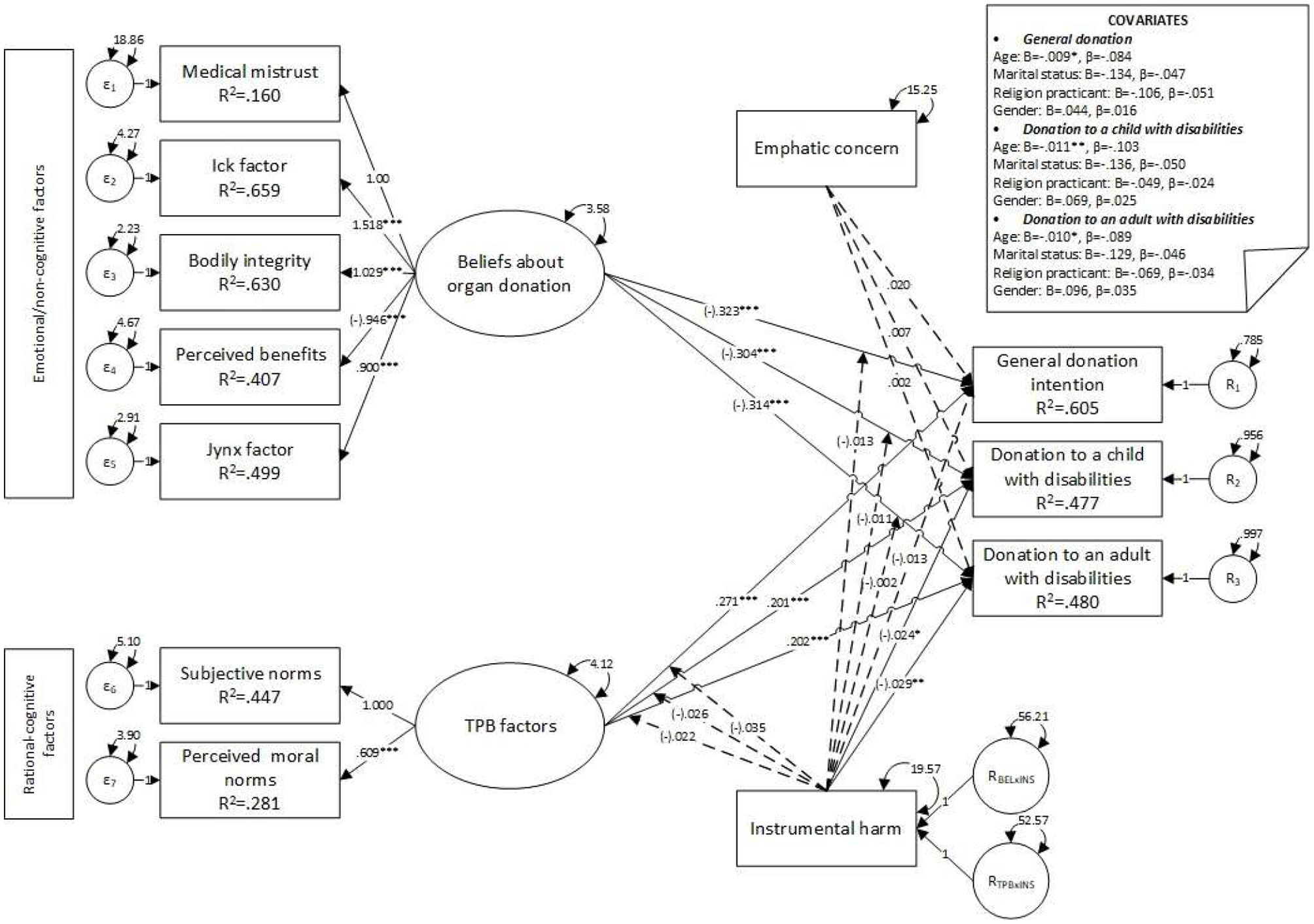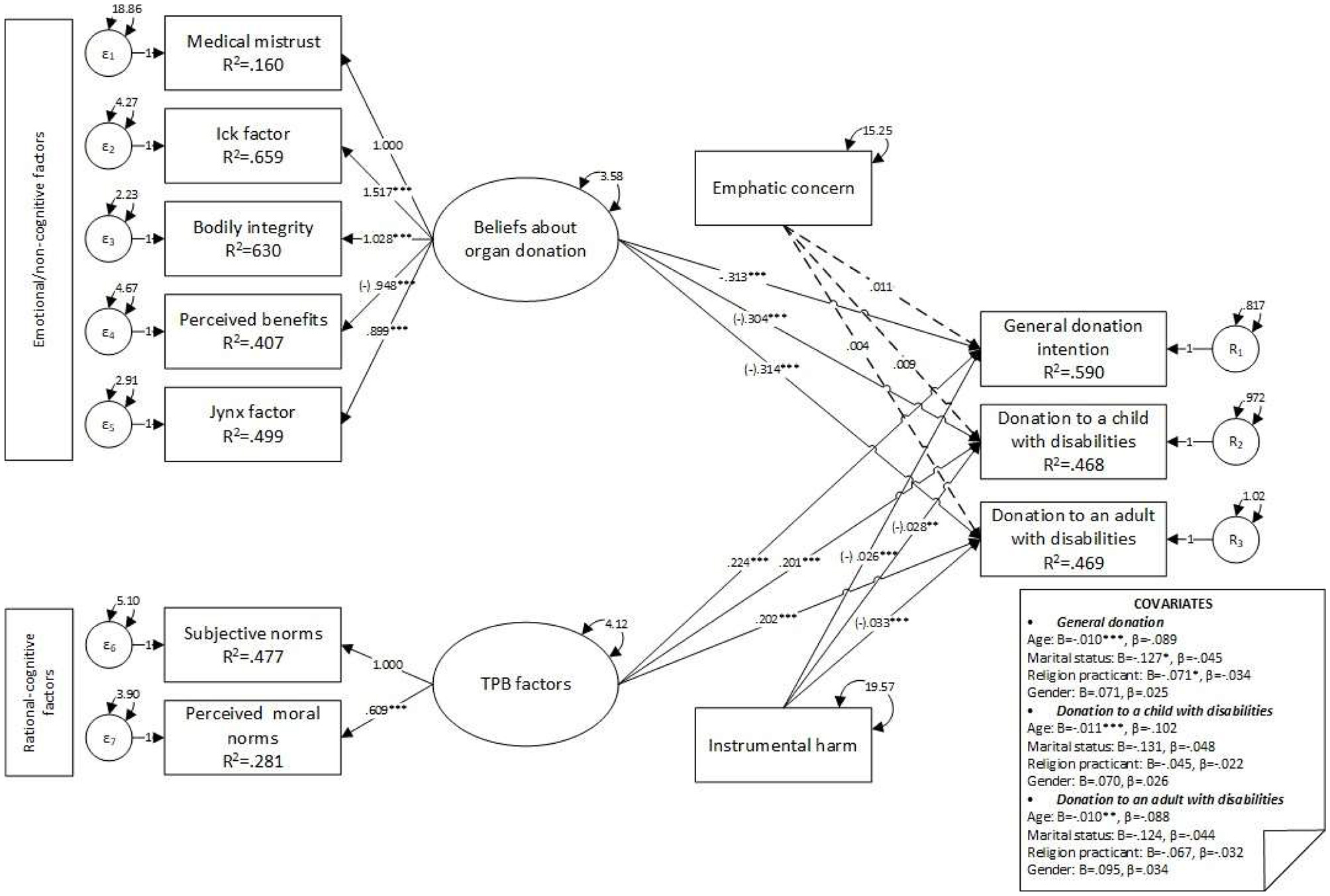This study investigated the multifaceted determinants of POD intentions and their complex interplay. We explored the roles of beliefs associated with organ donation, perceived subjective and moral norms, empathic concern, and instrumental harm in participants' overall intention to donate organs (with no other specifications about the recipient, donating to a child, or an adult with disabilities).
