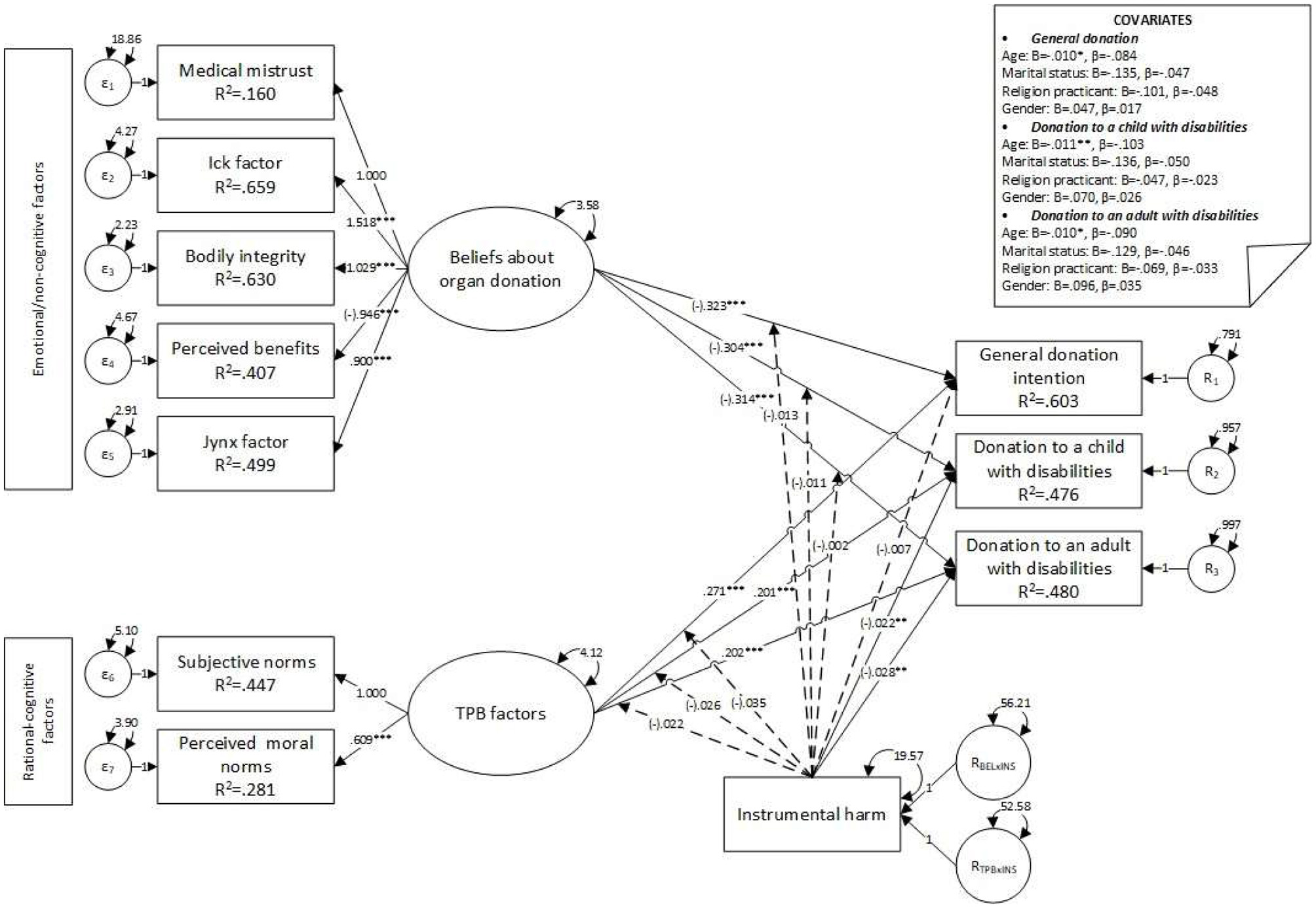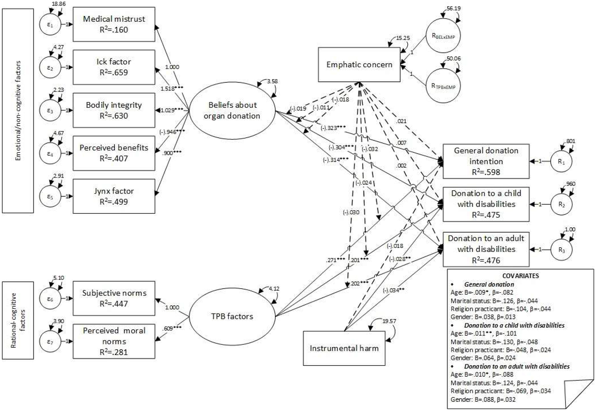 A moderated SEM model was assessed using robust SEM techniques, and parameters were estimated. For interaction terms, we defined the upstream latent variables “Beliefs about organ donation” and “Attitude toward organ donation” by setting up and assessing the measurement model. The predicted values for the latent variables were then extracted and added to the dataset. Then, we centered the predicted scores for the latent variables “Beliefs about organ donation” and “Theory of planned behavior factors” by their grand mean and the observed scores for the moderators “empathic concern” and “instrumental harm.” Products between each centered upstream variable and centered moderator variable were computed, resulting in the interaction terms. The effect of seven categorical variables was controlled for, including them as covariates in the model (i.e., education, marital status, number of children, religion, religious practitioner, gender, and age). Finally, four alternative, non-hierarchical SEM models were assessed. The first model included only main effects and covariates; the second model added only the interaction terms of empathic concern; the third model added only the interaction terms of utilitarianism; and the fourth model was the full moderated model. The models' comparison was performed using the LRT test to compare nested models (Satorra, 2000).