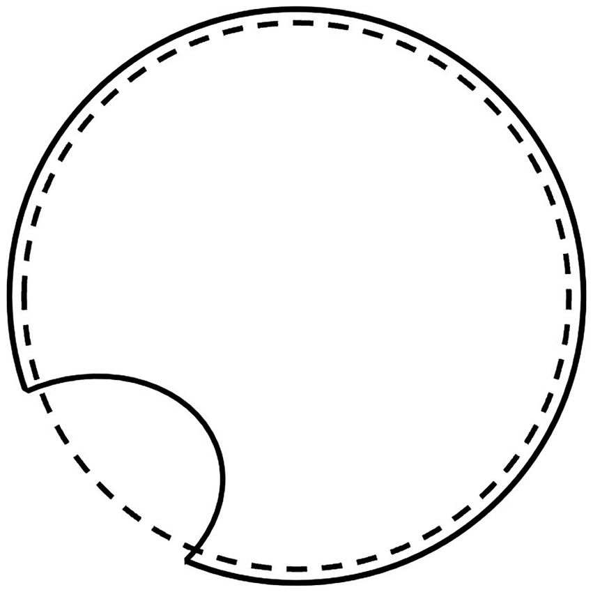 A circle with an indentation, representing the stimulus image, drawn with a continuous line, overlapped by the weak image, which represents the internally generated equilibrium condition, drawn with a dashed line.