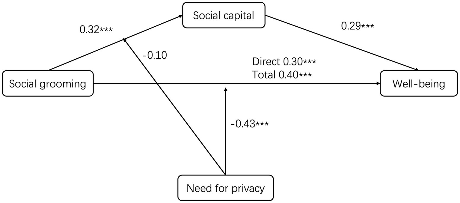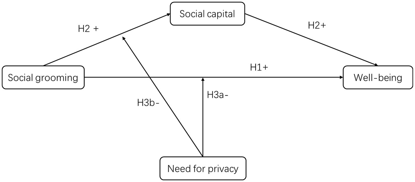 The need for privacy may be a moderator of social grooming because it embodies its theoretical function as a stable motivational reference point (Frener et al., 2024). Grounded in Altman’s (1975) balance of desired versus achieved privacy and control-centered definition, this need dictates how restrictive communication privacy management rules must be before a person feels comfortable enough to groom. Users with a low need tolerate wider audiences and minimal editing, enabling grooming to flow freely into social capital; users with a high need invoke tighter filters, post-capture review, and content selection, which can weaken both the spontaneity and relational payoffs of grooming. This personal set-point systematically shapes when and how boundary rules are enacted, independent of situational risk evaluations (Dienlin, 2023). Therefore, need for privacy may serve as a boundary condition for explaining why grooming behavior yields different well-being outcomes across individuals. Based on the above reasoning, we proposed the following hypothesis 3 (H3): The need for privacy negatively moderates the relationships between social grooming and (a) social capital and (b) well-being.