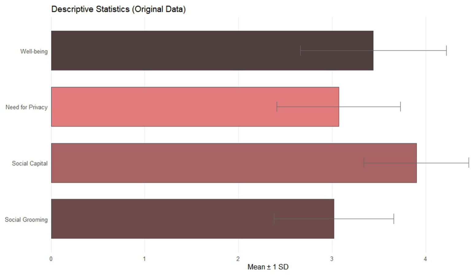 We employed SPSS (version 29; IBM Corporation, Armonk, NY, USA) to analyze data. We standardized original data (Table 1 and Figure 2 provide descriptive statistics). The distributional properties of each variable were deemed acceptable for standard parametric testing given that the absolute kurtosis values were all less than 10 and the absolute skewness values were all below 3. We used PROCESS Model 8 (Hayes, 2022) because our theoretical model proposes that the relationship between social grooming and well-being is mediated by social capital and moderated by the need for privacy. Bootstrapping was performed with 5,000 resamples to generate bias-corrected 95% confidence intervals for all estimates. The overall model yielded acceptable fit indicators, confirming its stability. No additional covariates were included in the final model.