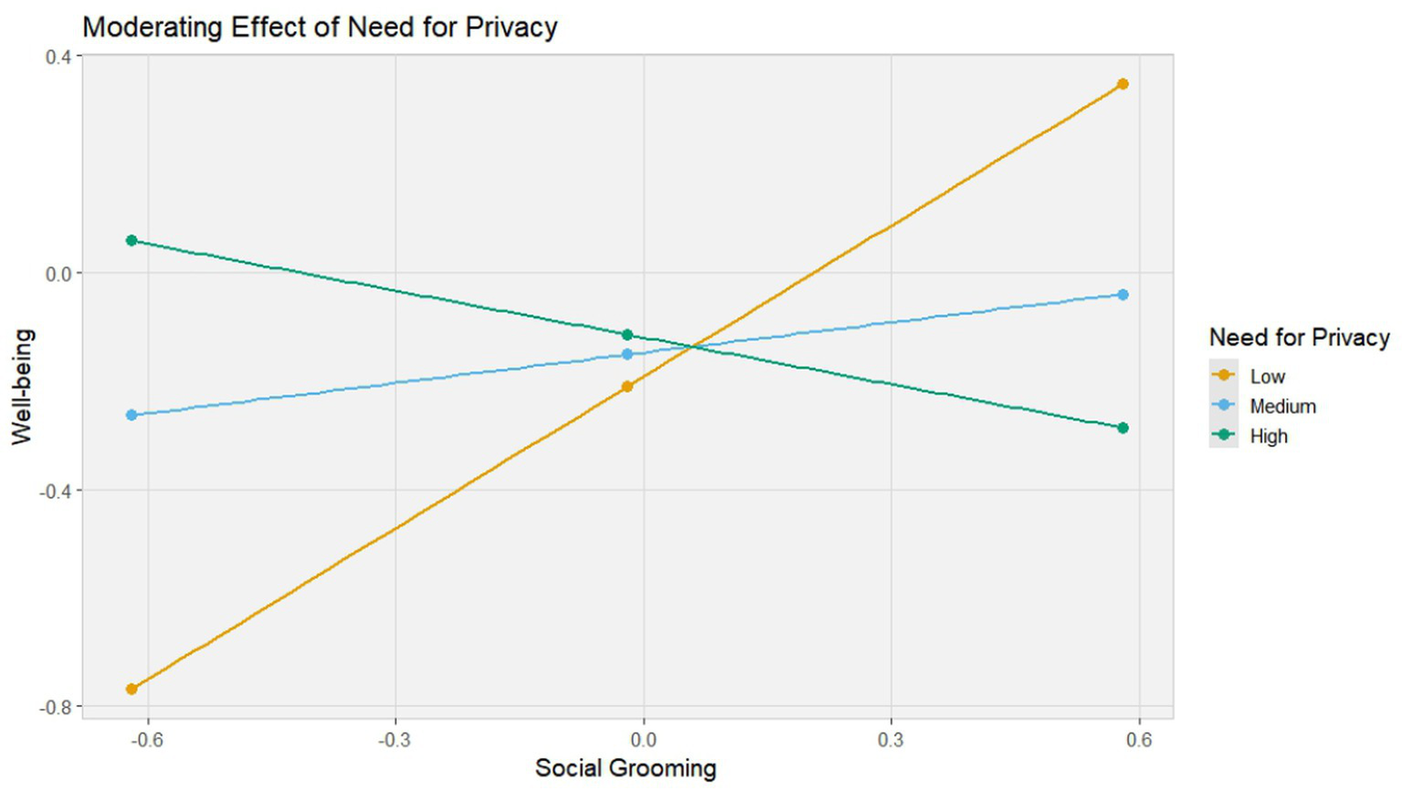 H3 examined whether the need for privacy moderates the mediation process, hypothesizing that a higher need for privacy would attenuate the associations of social grooming with social capital (H3a) and well-being (H3b). The interaction term between social grooming and need for privacy was not statistically significant when predicting social capital (b = −0.10, p = 0.15), thus failing to support H3a. However, as depicted in Table 3, the interaction term was significantly negative in association with well-being (b = −0.43, p < 0.001), providing clear evidence supporting H3b.