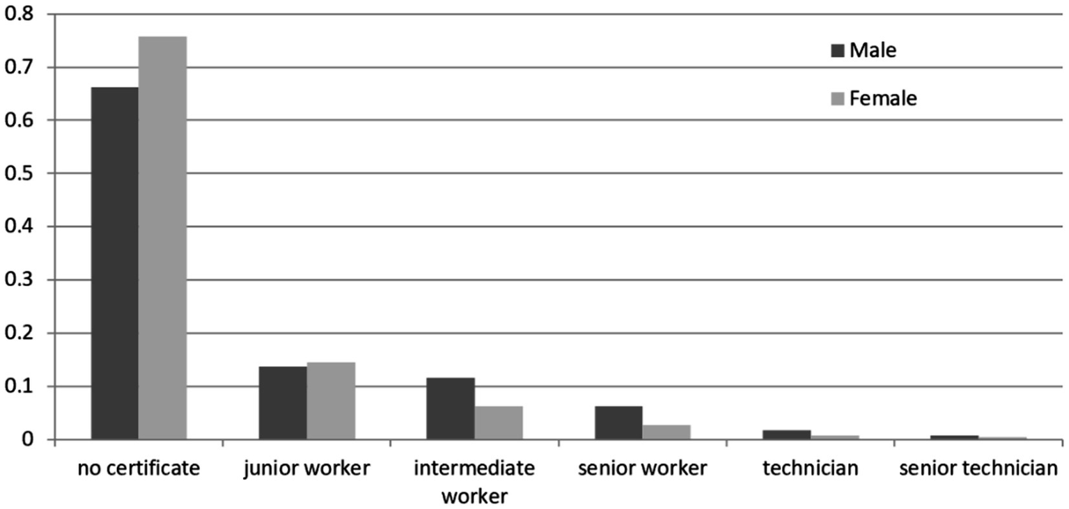 As to the variable of skill levels, we use occupational skill certificates as a metric of the surveyed workers’ occupational skill levels. In China, skill levels are assessed by firms and social organizations endorsed by the Human Resources and Social Security Department. Upon successful assessment, workers receive a certificate indicating their categorization into one of five grades: junior worker, intermediate worker, senior worker, technician, or senior technician. The occupational skill levels of the surveyed respondents are divided into six categories, with 1–6 representing hold no skill certificate to hold a senior technician certificate, respectively.