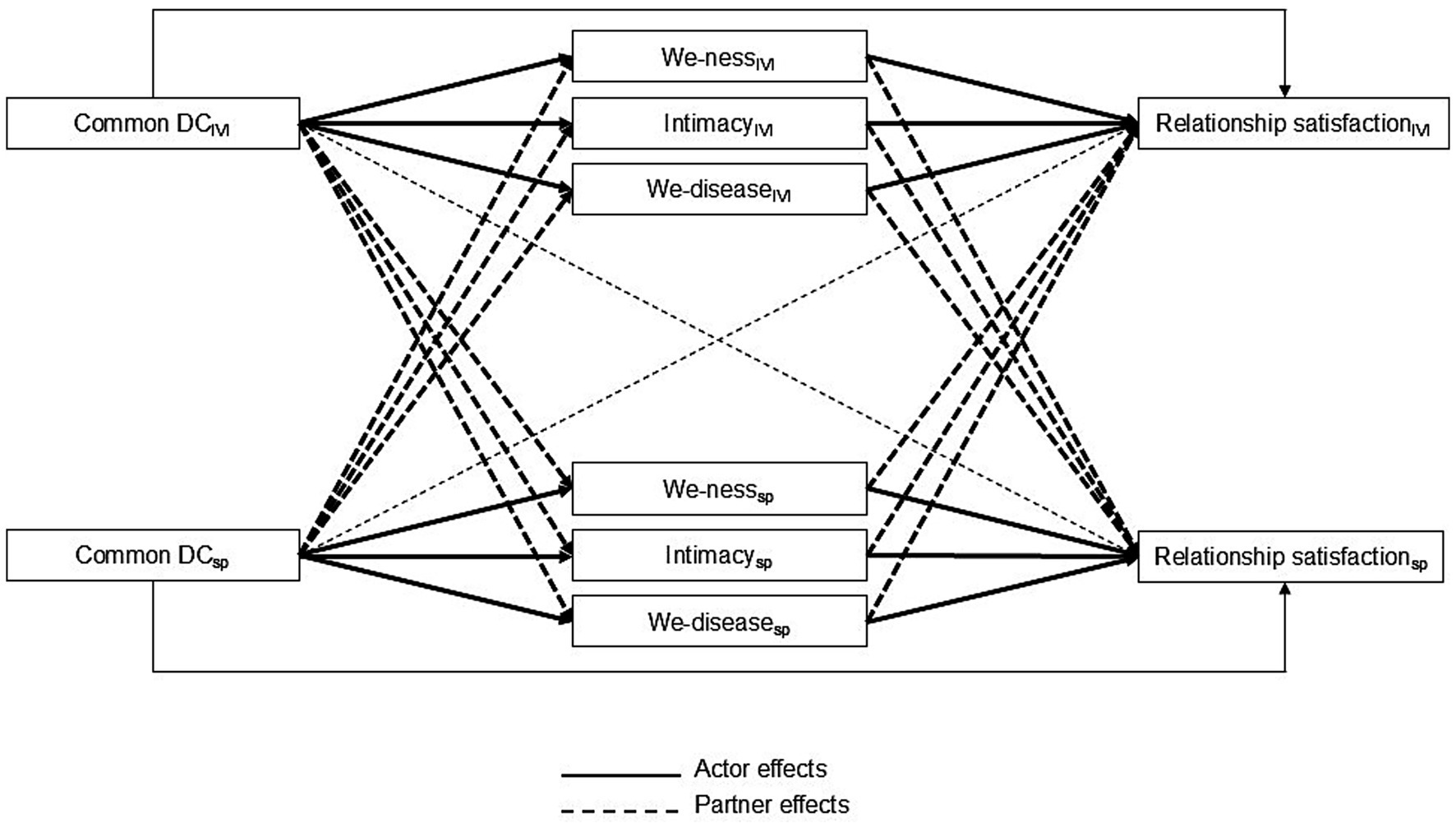 Paired t-test and Pearson correlations were computed for descriptive statistics and associations between study variables, respectively, using IBM SPSS, version 28. Pearson correlations (for continuous variables) and independent t-tests (for categorical variables) between all sociodemographic variables and relationship satisfaction were computed to identify potential covariates (only variables significantly associated with relationship satisfaction were controlled for in subsequent analyses). An Actor-Partner Interdependence Mediation Model (APIMeM; Ledermann et al., 2011) was computed in Mplus, version 8 (Muthén and Muthén 1998–2017) to assess whether we-ness, intimacy, and we-disease mediated the relationships between common DC and relationship satisfaction. All variables were included in the same mediation model to allow for the evaluation of the unique contribution of each mediator. Bootstrap resampling procedures with 1,000 samples was computed to estimate statistical significance of the total, direct and indirect effects with a 95% bias-corrected confidence interval; when the confidence interval did not include zero, the effects were considered significant.