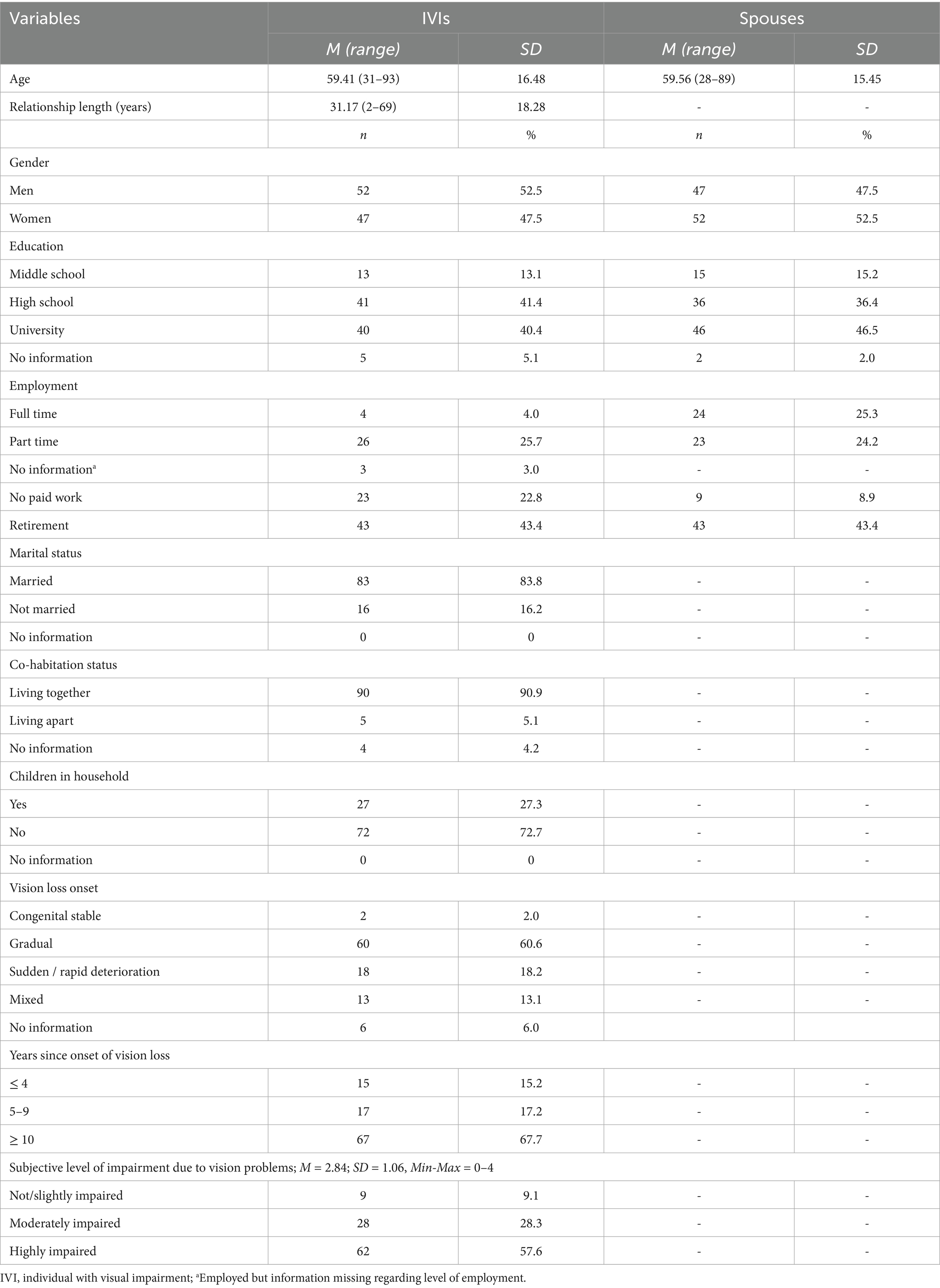 The sample of the current study consisted of N = 99 different-gender couples (N = 198 individuals) (see Table 1). Individuals with vision impairment (IVI) were on average 59.41 years old (SD = 16.48) and spouses on average 59.56 years old (SD = 15.45). Of IVI, 52.5% identified as men and 47.5% as women. Approximately 40% of IVI and spouses had a university degree and around 40% had completed high school. While half of the spouses was working at the time of the study, approximately a third of IVI was paid for working. Couples were in the current relationship for an average of 31 years. Most couples were married and lived together without children in household. Regarding the vision impairment, around two thirds of IVI experienced a gradual decline (60.6%) and lived with vision impairment for 10 years or longer (67.7%). Most IVI (57.6%) felt highly impaired due to their vision impairment.