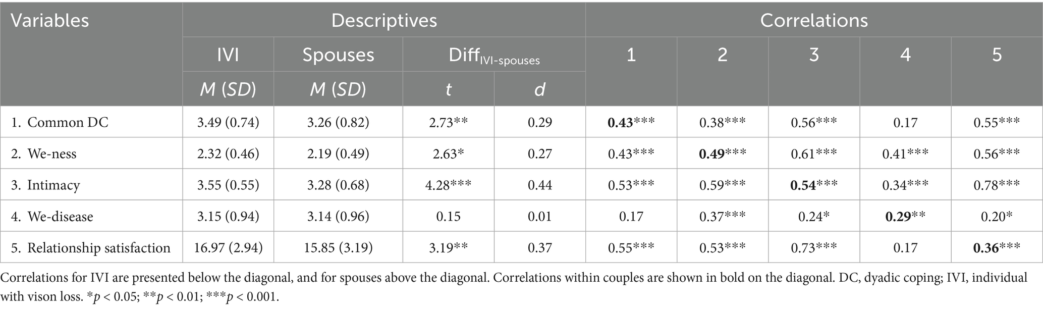 Compared to their spouses, IVI reported higher levels of intimacy, we-ness, common DC, and relationship satisfaction. IVI and spouses reported similar levels of we-disease. IVI and spouses’ scores were moderately to strongly correlated, showing dyadic interdependence. Overall, study variables were significantly, positively, and moderately to strongly correlated with each other; smaller associations were found for we-disease (see Table 2).