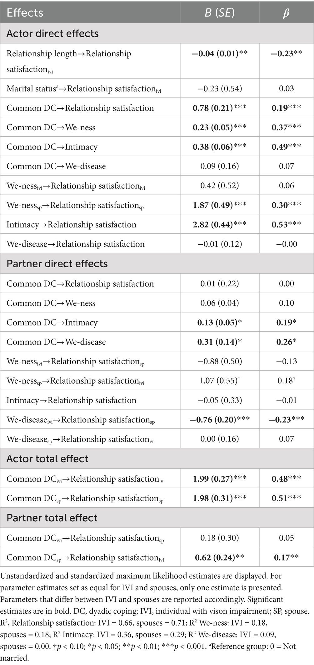 The fully constrained model yielded a qui-square of 33.59, df = 16, p = 0.006. We unconstrained successively each path of coefficients and examined whether model fit would improve. Two partner effects and one actor effect were allowed to vary freely across IVI and spouses as the model fit improved significantly: the partner effect of we-ness on relationship satisfaction (Δχ2 = 11.26, Δdf = 1, p < 0.001) and of we-disease on relationship satisfaction (Δχ2 = 17.23, Δdf = 1, p < 0.001), and the actor effect of we-ness on relationship satisfaction (Δχ2 = 5.47, Δdf = 1, p = 0.019). The model included two covariates, relationship length and marital status, given their significant associations with IVI’s relationship satisfaction. The final model fitted the data well: χ2 = 5.97, df = 13, p = 0.947; RMSEA = 0.000; SRMR = 0.034; CFI = 1.000, and explains 66 and 71% of the variance of relationship satisfaction for IVI and spouses, respectively.