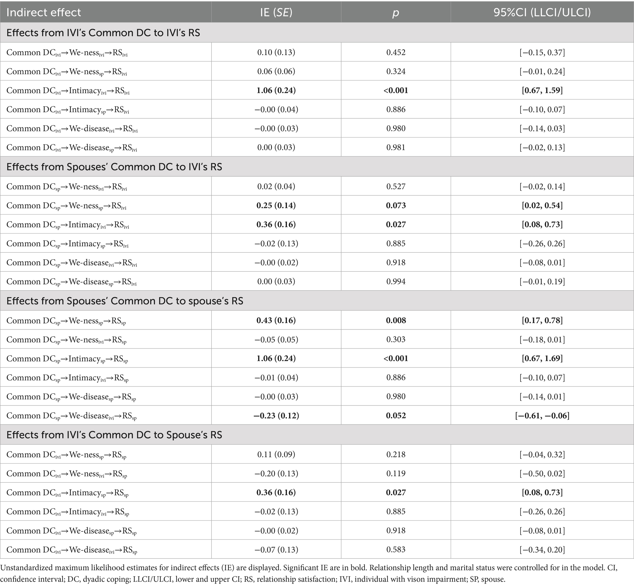 Introduction: Common DC, how couples cope together with stress, may protect couples from relationship dissatisfaction in the context of vision impairment. However, the mechanisms through which common DC relate to couple satisfaction are underexplored. This study aimed to examine whether we-ness, intimacy, and perceiving vision impairment as a we-disease mediate the relationship between common dyadic coping (DC) and relationship satisfaction in the context of vision impairment.