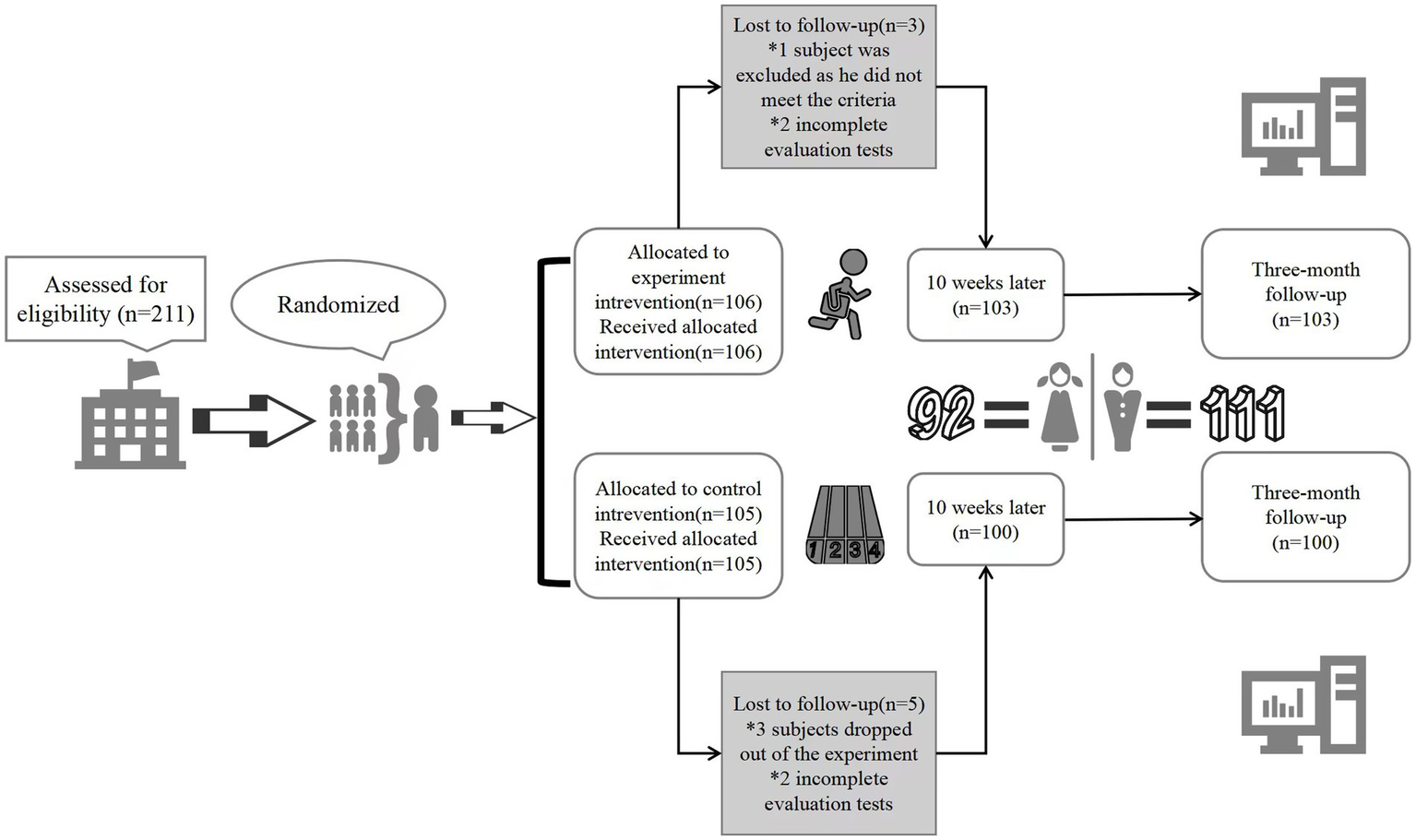 A total of 211 participants were initially enrolled. Among these, one was excluded due to not meeting the criteria, three withdrew during the study, and four failed to complete assessments. Ultimately, 203 participants (92 females, 111 males; ages 8–10 years, mean age 8.9 ± 0.67 years) completed the full experimental protocol, including 103 in the experimental group and 100 in the control group. Detailed procedures are illustrated in Figure 1.