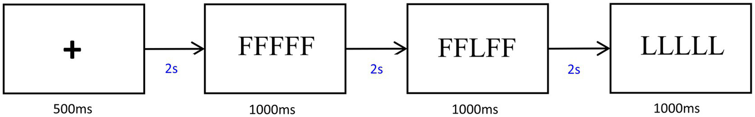 The Flanker task began with a fixation cross (“+”) displayed for 500 milliseconds. Next, a letter array appeared centrally on the screen under either consistent (“FFFFF,” “LLLLL”) or inconsistent (“LLFLL,” “FFLFF”) conditions. Each was displayed for 1,000 milliseconds, with a 2-s interval between stimuli. Both conditions were presented randomly and in equal proportion, as illustrated in Figure 2. Participants were required to quickly and accurately identify the central letter: press the “F” key for “F” or the “L” key for “L” using the index finger. After 12 practice trials, participants completed 48 formal trials. Inhibitory control was calculated by subtracting the reaction time in consistent trials from that in inconsistent trials. A smaller difference indicates better inhibitory control.