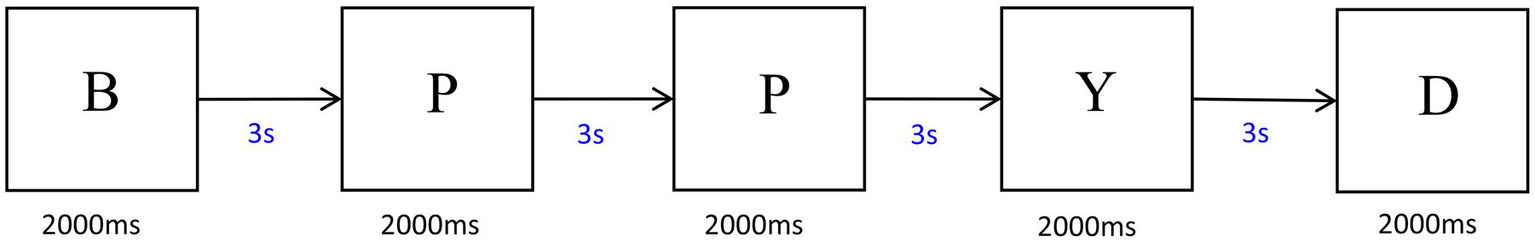 The 1-back task used five English letters (“B,” “D,” “L,” “Y,” “P”) as stimuli. After the task began, each letter was individually presented at the center of the screen. Each stimulus was displayed for 2 s, followed by a 3-s interstimulus interval, as shown in Figure 3. Participants were asked to determine whether the current letter matched the one presented immediately before. If the letters matched, the “F” key was pressed; otherwise, the “J” key was used. After 12 practice trials, participants completed 25 formal trials. Working memory performance was measured by the average reaction time. Shorter reaction times indicated better working memory capacity.