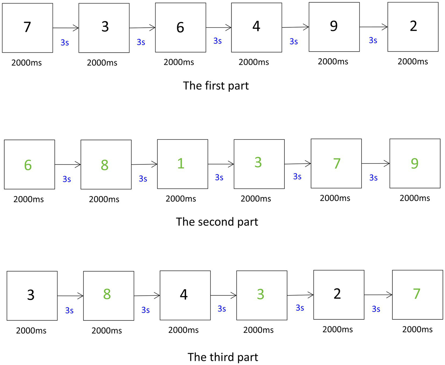 The More-Odd Shifting Task consisted of three parts. Part One (Numerical Judgment): Participants judged the magnitude of black numbers (1–9, excluding 5) presented on the screen center. The “D” key was pressed for numbers greater than 5, and the “F” key for numbers less than 5. Part Two (Parity Determination): Participants determined the parity of green numbers (1–9). Odd numbers required a “J” key response, even numbers required the “K” key. Part Three (Mixed Judgment): Tasks varied by color—black numbers required magnitude judgments, green numbers required parity judgments. Response keys remained the same as in the previous sections. Participants were instructed to respond as quickly as possible while maintaining accuracy. Each stimulus was displayed for 2000 milliseconds, with a 3-s interval between trials, as shown in Figure 4. Parts One and Two included 8 practice and 16 formal trials each. Part Three included 16 practice and 32 formal trials. Cognitive flexibility was calculated by subtracting the average reaction time of Parts One and Two from that of Part Three. Smaller differences indicated better cognitive flexibility.