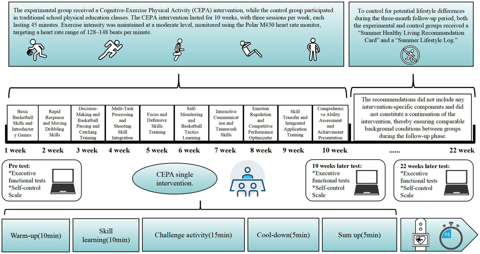 Based on empirical studies and meta-analytic findings indicating that at least 8 weeks of intervention are required to produce significant effects (de Greeff et al., 2018; Xu et al., 2023), this study designed a 10-week intervention cycle and innovatively set up a three-month follow-up measurement after the intervention to comprehensively evaluate the persistence of the intervention effect. Both the experimental and control groups received interventions that occurred three times a week for 45 min per session, both maintaining moderate intensity (heart rate monitored using Polar M430, with a target range of 128–148 beats per minute). The experimental group focused on CEPA, integrating cognitive challenges into sports, including team games requiring concentration and rapid decision-making, coordination exercises emphasizing memory-movement integration, and interactive sports requiring continuous task or movement pattern adjustments. This integration of cognitive tasks aimed to enhance students’ cognitive abilities and psychological adjustment, while also promoting overall physical fitness. The class and test process of the experimental group is shown in Figure 5. The control group participated in traditional physical education courses, focusing on basic physical training, regular sports games, and motor skills practice. The complete 10-week course plan is shown in Appendix 1.