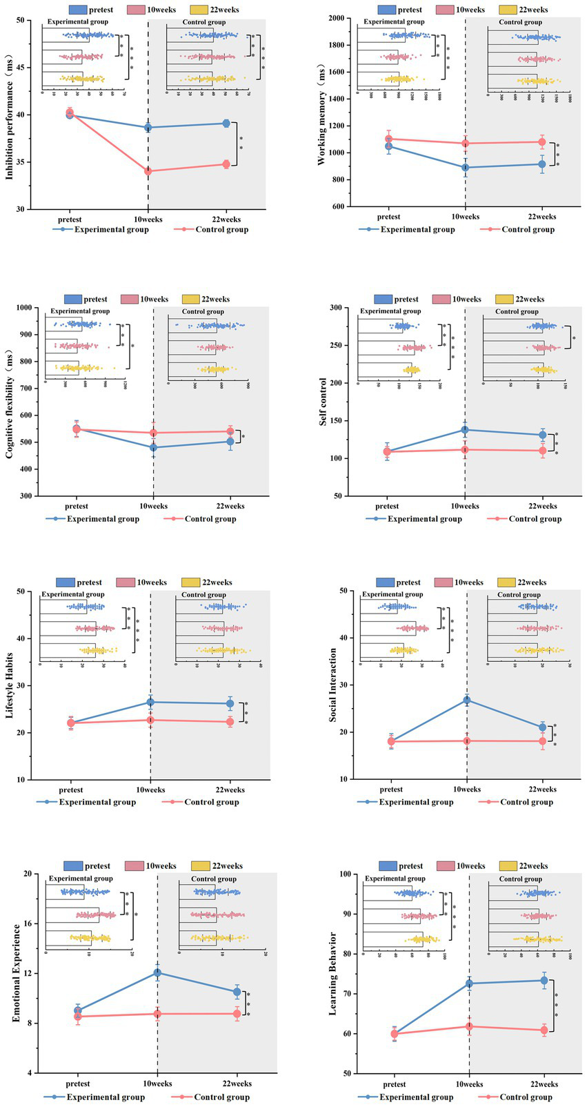 Linear mixed-effects model analysis revealed significant time × group interaction effects for the total score of self-control [F(2, 599.2) = 66.118, p < 0.001, ICC = 0.040], lifestyle habits [F(2, 598.3) = 9.790, p < 0.001, ICC = 0.006], social interaction [F(2, 601.0) = 61.480, p < 0.001, ICC = 0.000], emotional experience [F(2, 599.4) = 8.792, p < 0.001, ICC = 0.004], and learning behavior [F(2, 599.1) = 18.715, p < 0.001, ICC = 0.072], indicating different changing patterns in self-control performance between the experimental and control groups across time points (see Figure 6). The mean values (M ± SD), variation amplitudes, and effect sizes for each index at different time points are shown in Table 3.
