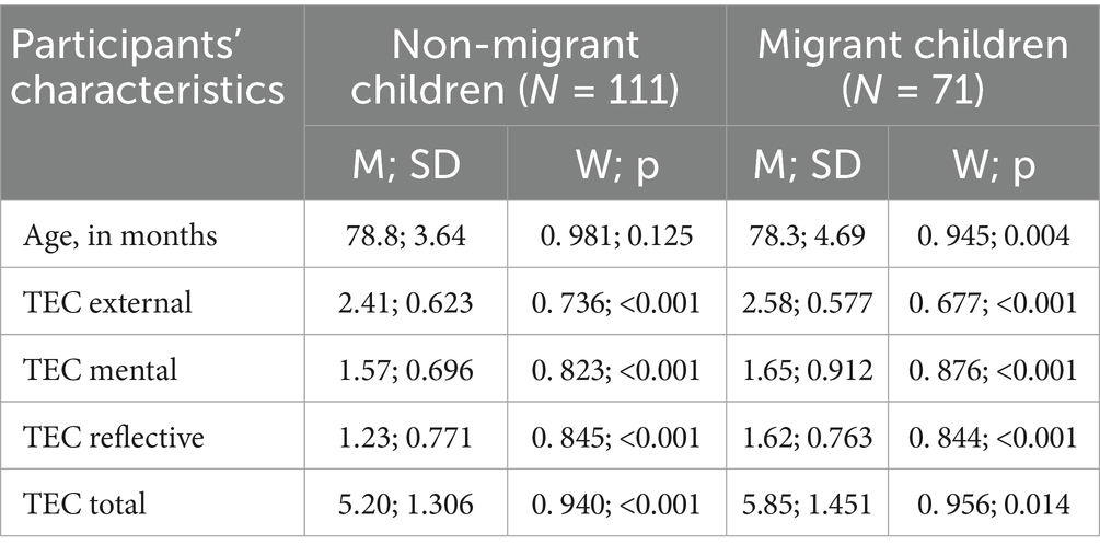 The sample consisted of 182 typically developing children (93 boys, 89 girls) aged 6–7 years (M = 78.5 months; SD = 3.96 months) attending public kindergartens in Moscow. All participants were neurotypical and native Russian speakers. The sample was divided into: (1) migrant children (n = 71, 49% boys; families moved to Moscow within 3 years, 65% children relocated to Moscow from another region), and (2) non-migrant children (n = 111, 52% boys). Caregiver questionnaires indicated predominantly middle socioeconomic status: 90% of caregivers held university degrees, and 72% of families reported average income levels. Note that income data were based on caregiver self-reports rather than objective measures.